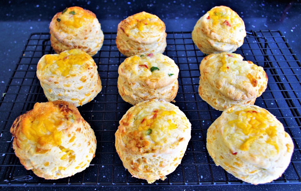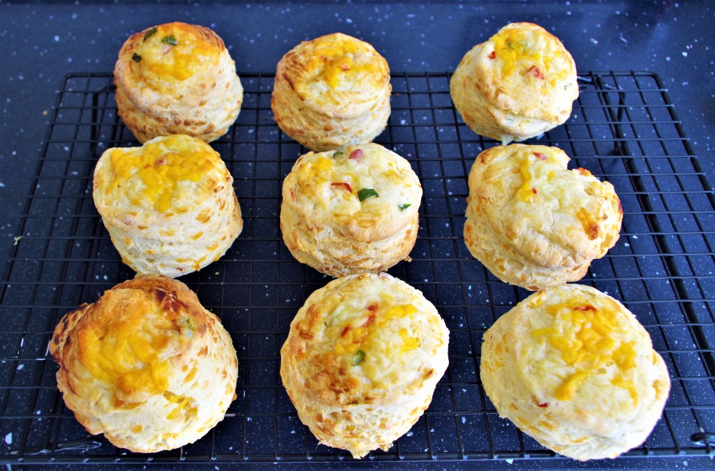 7. Brush some spare milk or buttermilk over the top of each scone and add a little of the reserved cheese and chillies to each one. Bake for 12 – 14 minutes.