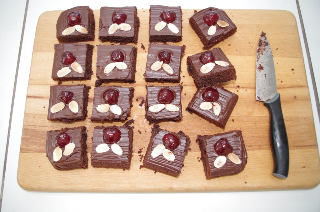 6. To decorate, melt the chocolate and butter together and pour or brush it onto the top of the uncut brownie slab. Working quickly, before the chocolate sets, place 16 cherry halves evenly in a 4 x 4 pattern (assuming this is how you will cut the slab) Add two pieces of flaked almond next to each cherry piece.