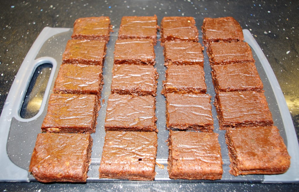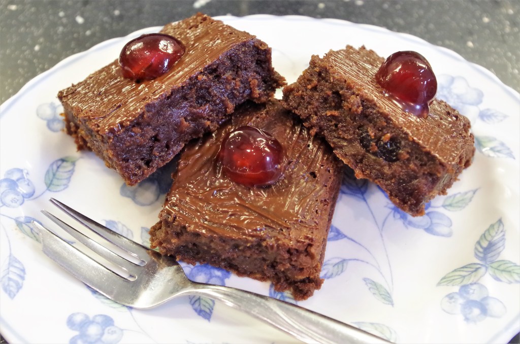 ……. and I wanted to make brownies for a group of mums who bring their pre-school children to our church building for activities each week. I had lots of glace cherries left from my pre-Christmas baking and also extra oranges. So, here’s the result and what a nice one it is too – brownies with lovely flavour and a superb gooey texture.