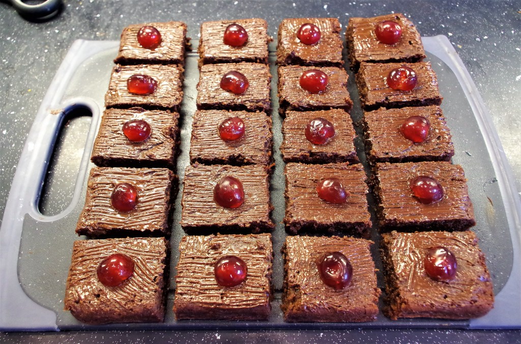 8. Cut the slab using a hot knife. Melt about 25g/1oz chocolate and brush it over the brownies then add half a cherry to each. (If you cut your slab into large pieces then use 2 or 3 cherry halves on each.)