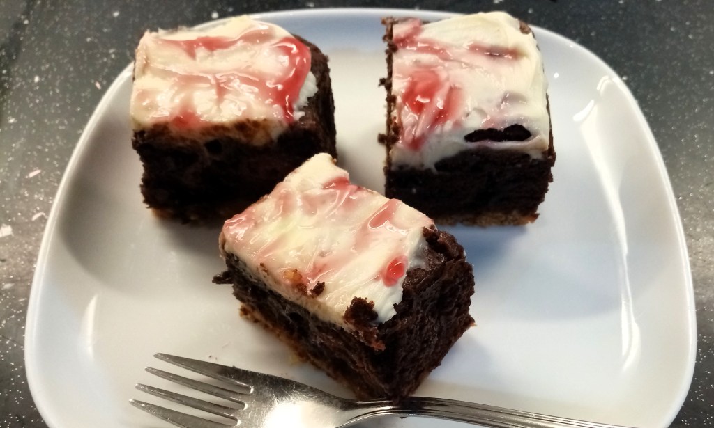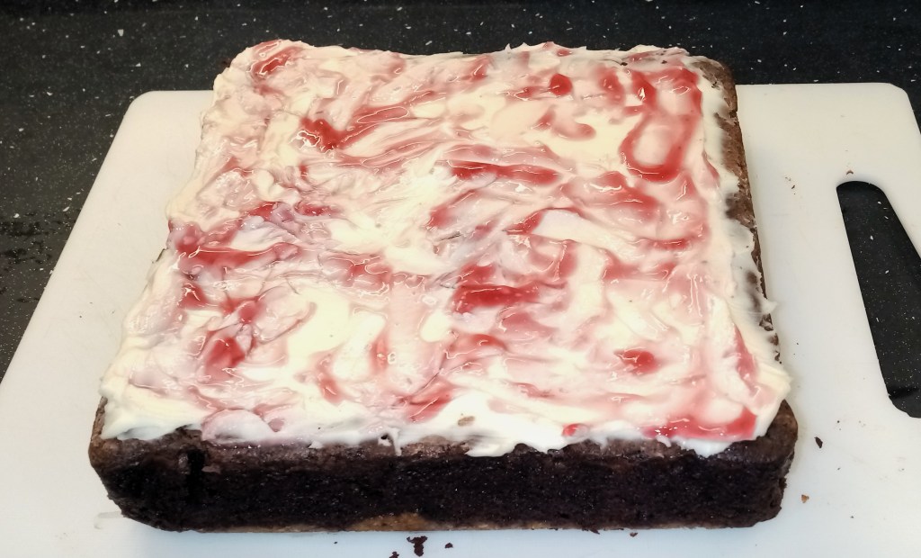 10. For the topping, mix the mascarpone with the icing sugar then stir in the cherry and/or vanilla flavourings. Spread this mixture over the cooled brownie block. Add blobs of cherry filling liquid on top then swirl into a pattern using a cocktail stick. Place in the fridge for at least an hour then cut into pieces.
