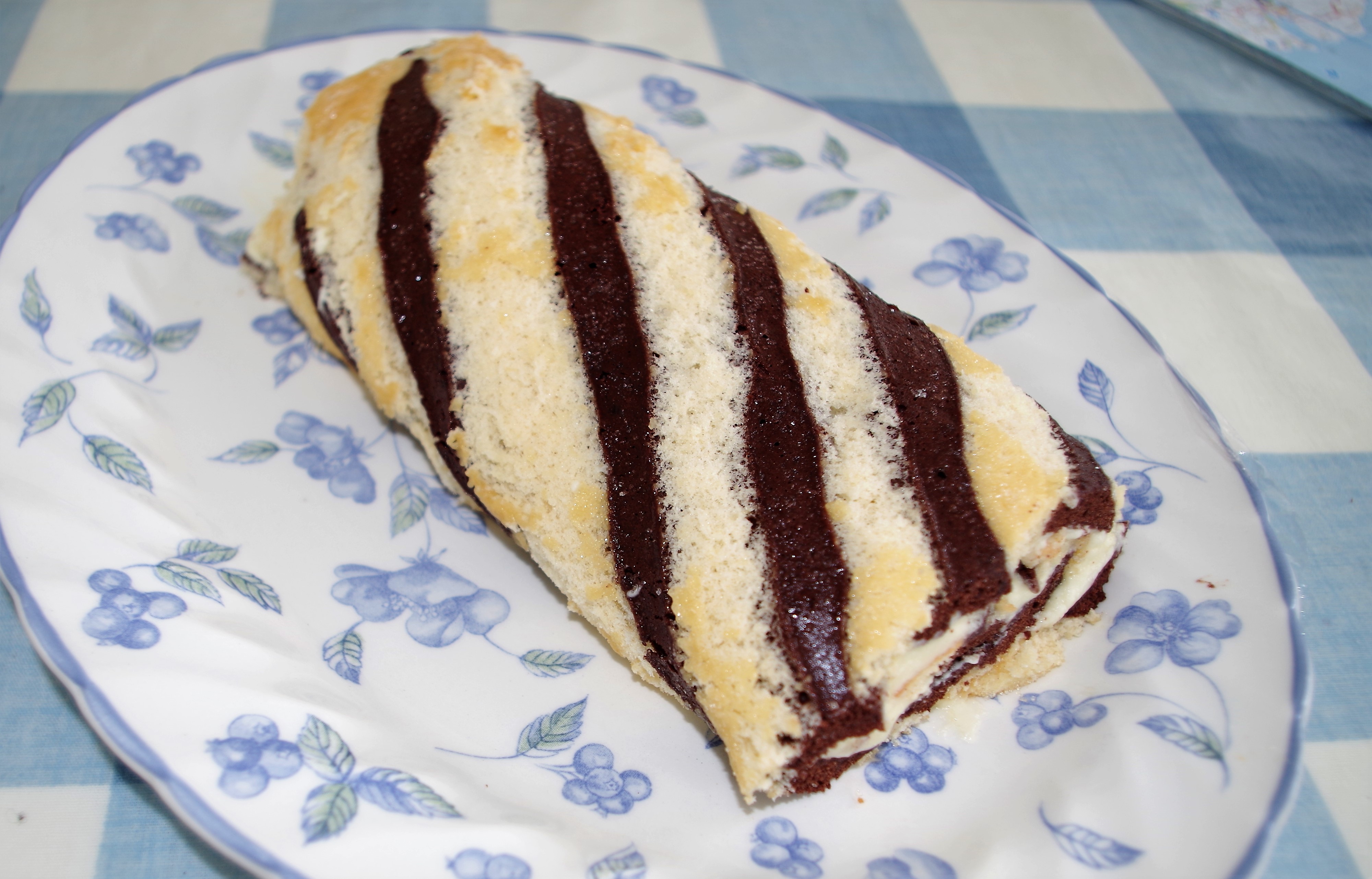 10. When the sponge is sufficiently cool, cut a line across one short end about 1cm (½”) in. Take care not to cut the whole way through the sponge. Working from the cut, spread the cream filling over the rest of the sponge.