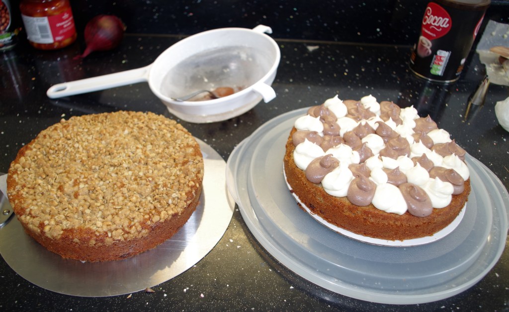 8. Carefully pour the mixture equally into the prepared tins. Scatter the crumble topping over one cake and bake them both for about 50 – 60 minutes. Check them with 15 mins to go. If the surface is browning too much, cover with foil.