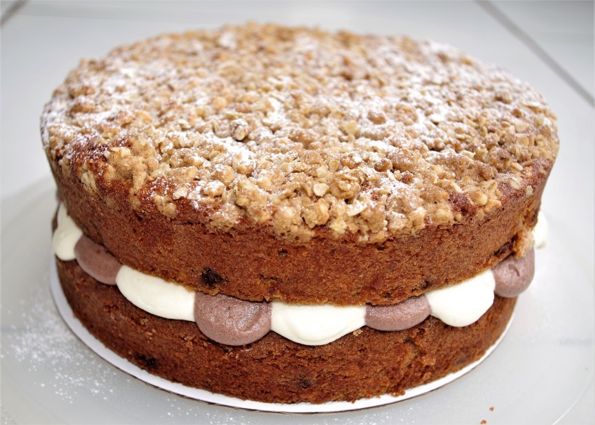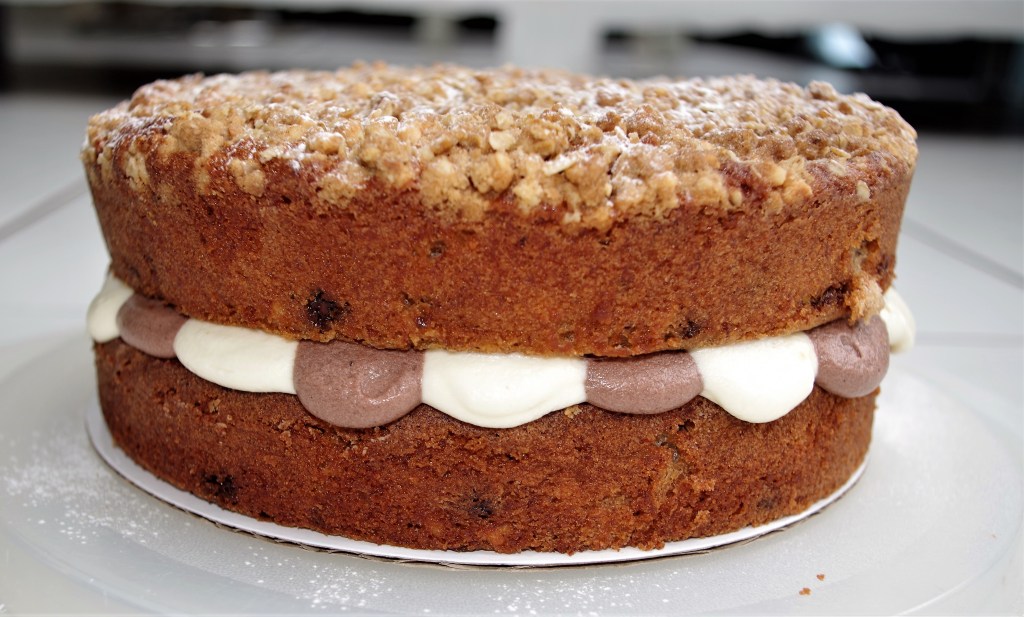 Here’s a lovely cake that combines two great flavours. It’s firm and moist with a terrific texture, made even better by the scrumptious crumbly topping and smooth, rich filling.