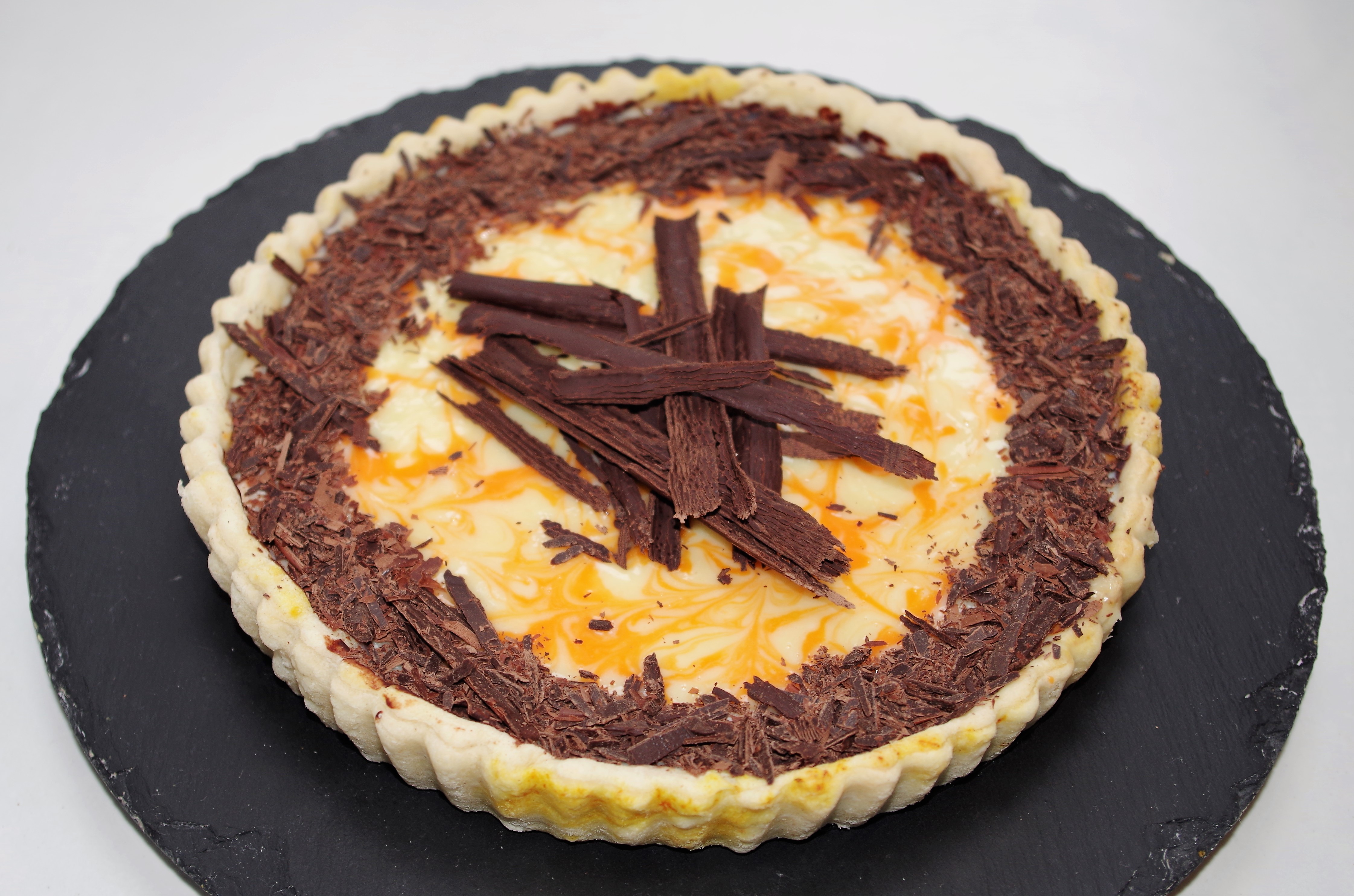 7a. An option would be to take off about 50g of the mixture before it goes into the pastry case and colour this orange, possibly adding in ½tsp orange essence. Pour the main mixture into the pastry case then add this part and swirl it with a cocktail stick.