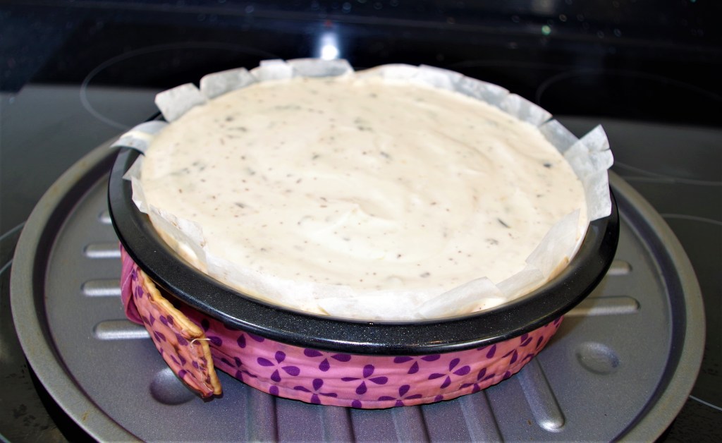 10. Place the tin on a baking sheet in case of leakage then bake for around 70 minutes (23cm tin) or 65 minutes (20cm tin). Check a few minutes ahead of time. It needs to be set around the edges, possibly pulling away from the sides, but still a little wobbly in the middle. Turn the oven off and leave the door slightly open with the cheesecake inside until it has cooled.