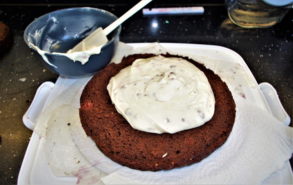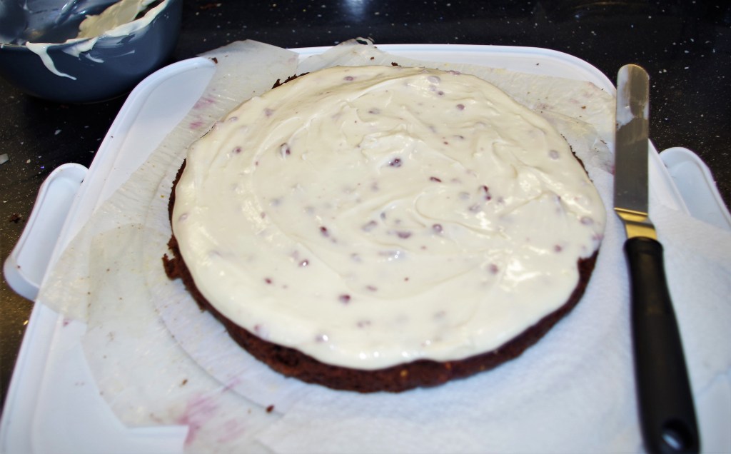 10. Allow the chocolate mixture to cool a little then pour it onto the cream cheese. Beat well then sift in the icing sugar. Mix it in carefully at first, then beat more vigorously until it’s a reasonably firm mixture and stir in the freeze dried raspberries. Use this filling to combine the two cakes. Place in the fridge for at least 30 minutes, or even overnight.