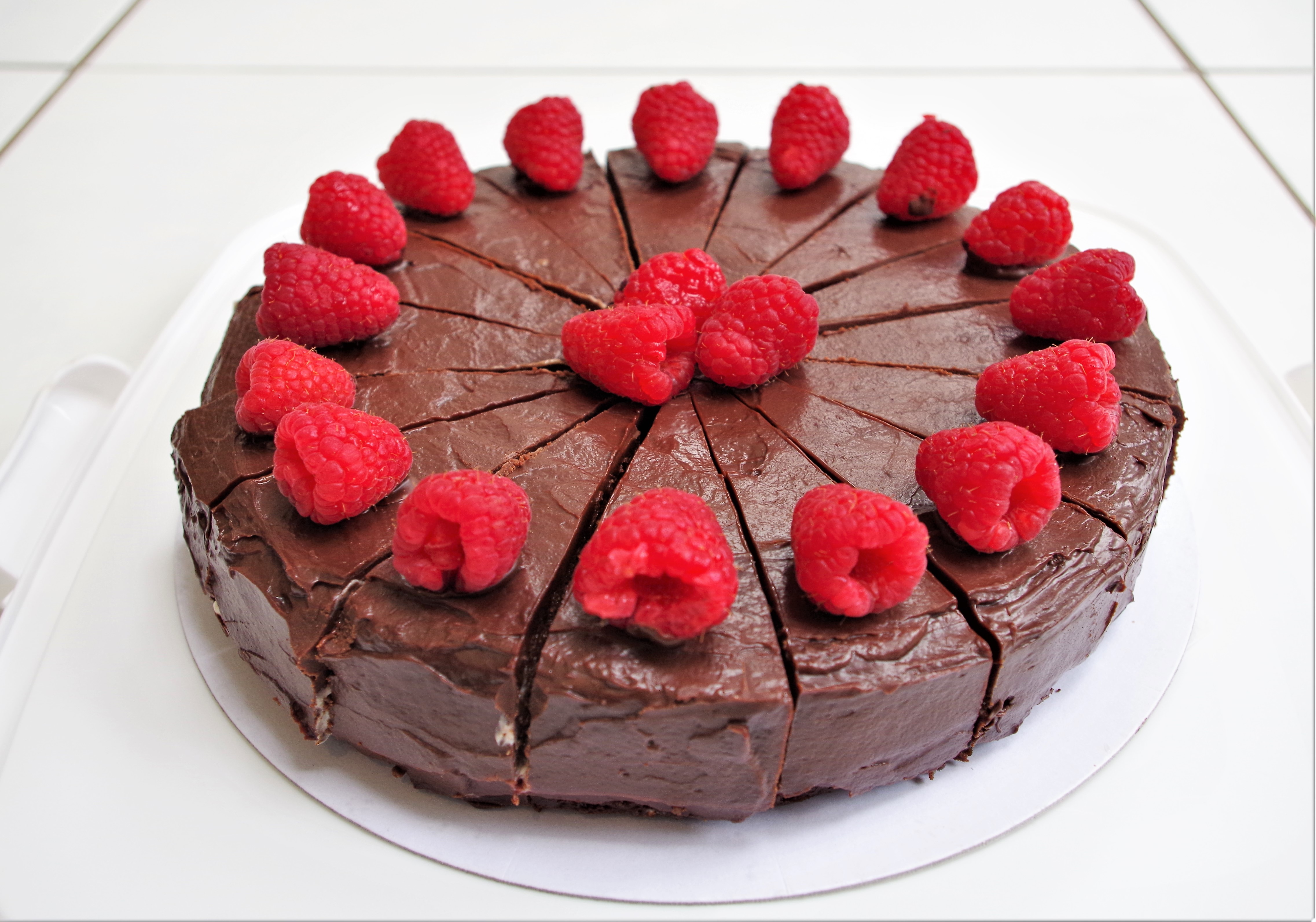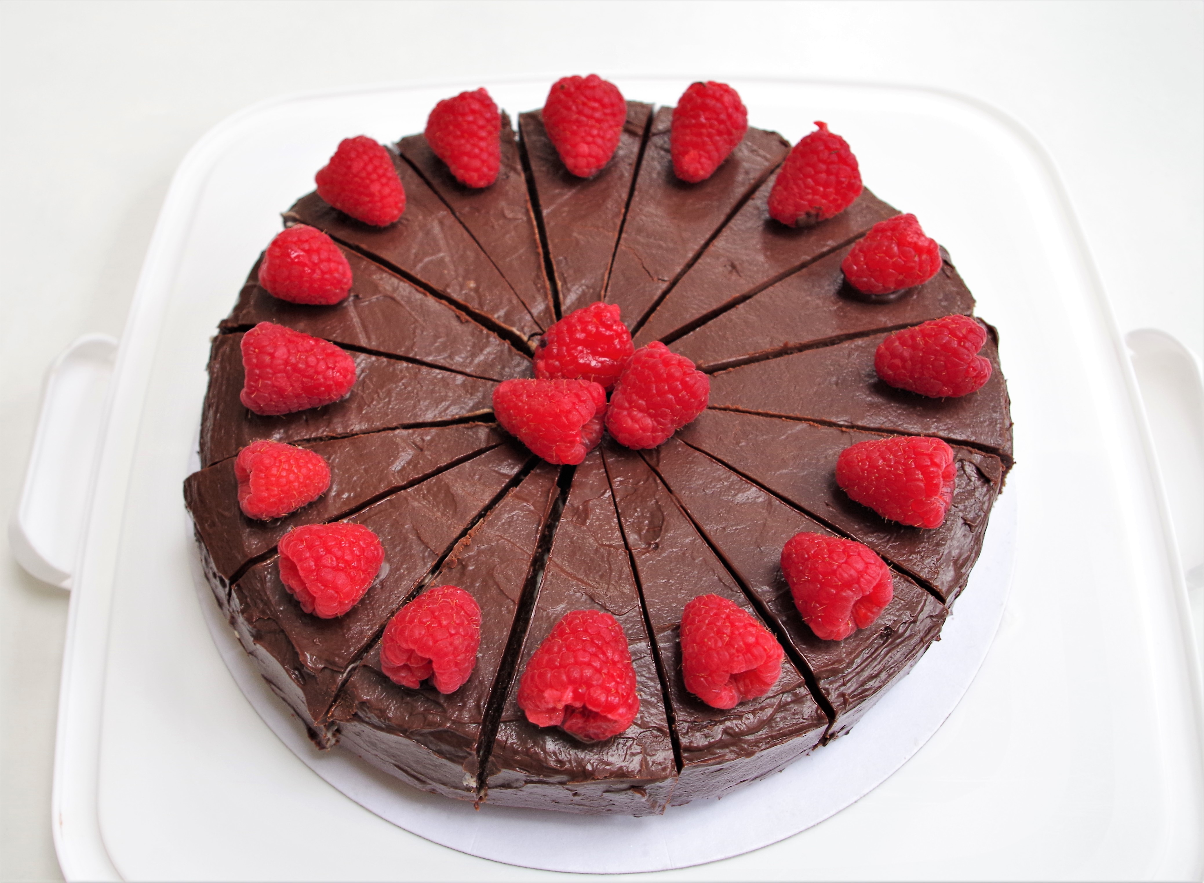 13. When it’s cooled sufficiently, pour or spoon the topping onto the cake starting in the middle. Work it gently outwards and down the sides. Before it sets, decorate with raspberries*.