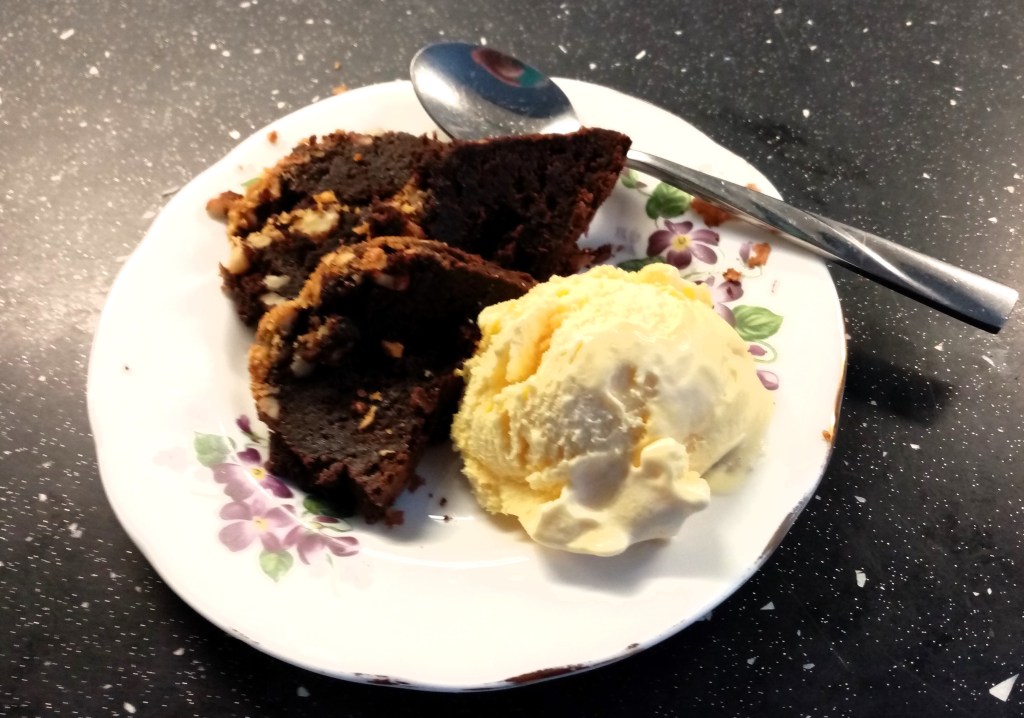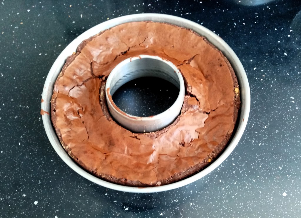 Do you find that when you bake brownies in a standard 20cm/8” square tin and cut them 4 x 4, the outer twelve are just right, but the four in the middle are too soft, even runny? It’s happened to me a few times, so here’s my answer – don’t have a middle, use a ring mould. I tried it as an experiment and was pleasantly surprised at how well it turned out.