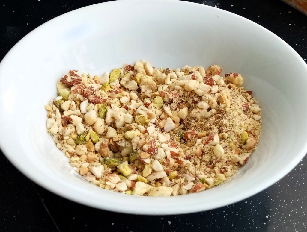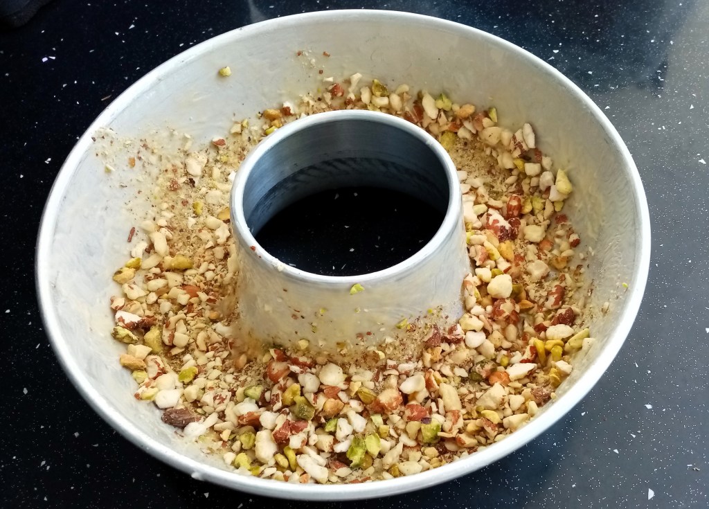 3. Re-butter the lower part of the ring mould and add in the mixed chopped nuts. It’s up to you how far up the sides you have the nuts. If you want nuts on the side you will need to brush melted butter on the sides. Give the mould a good shake once the nuts are in. (see gallery 1)