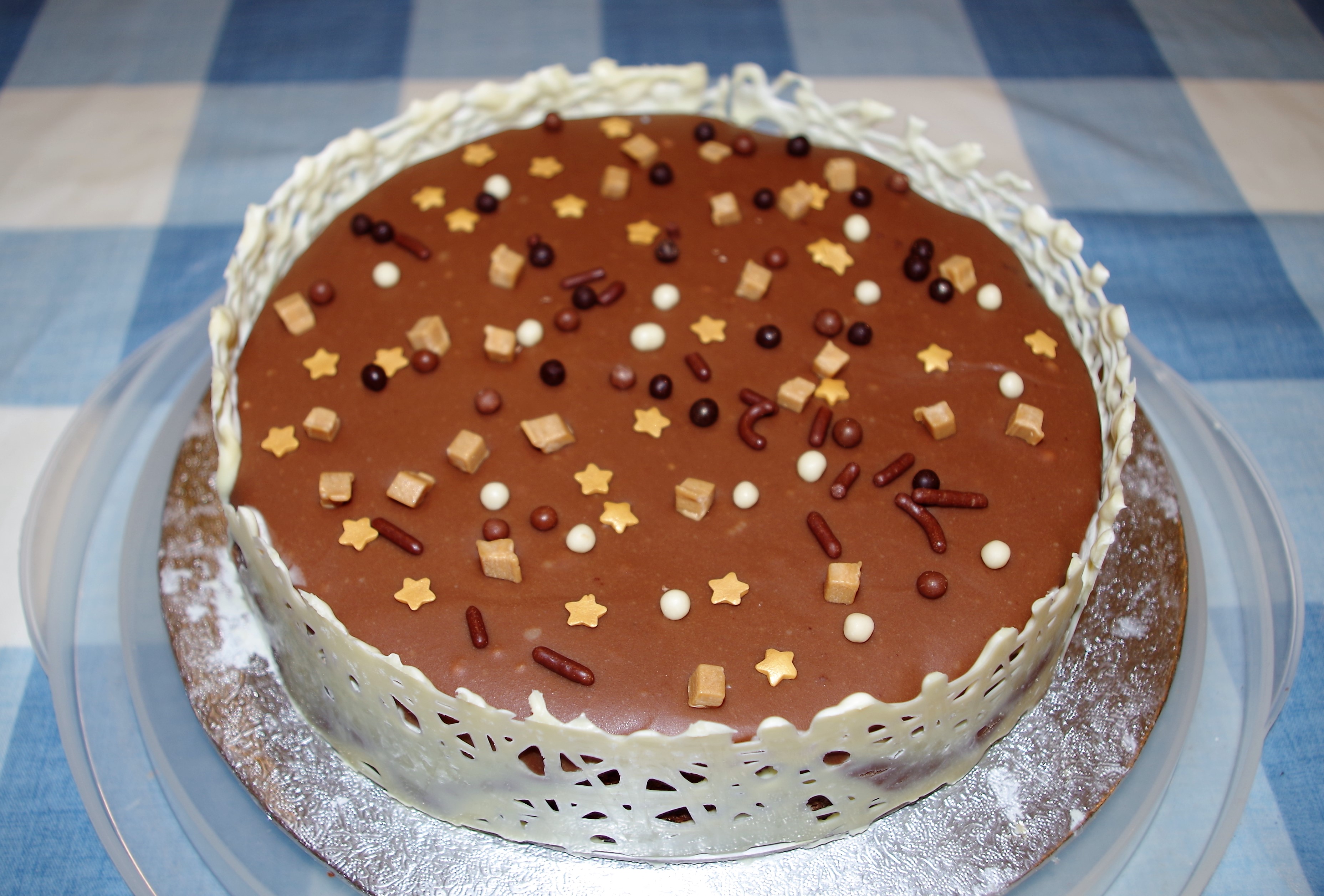 Like chocolate? (Silly question, I know.) Then you’ll love this. But not just chocolate: coffee and caramel too. All blend together to give a lovely rich and shamelessly luxurious treat. The white chocolate collar is optional, but worth the effort, if only to add even more chocolate.