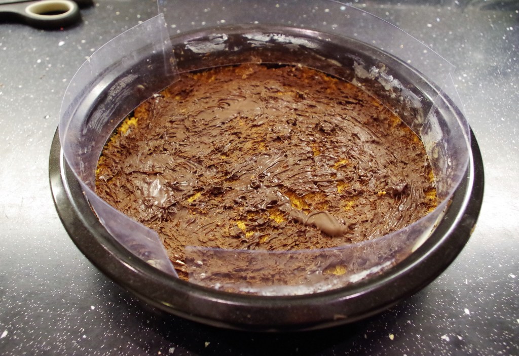 4. This bit is optional. I was concerned in case the torte mixture would make the lovely crisp base go soggy so I melted about 50g/1¾oz dark chocolate and brushed it onto the base. I’m not sure if it did what I wanted, but no one is going to complain about another layer of chocolate are they?