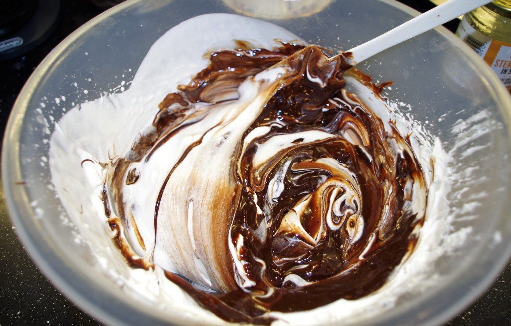 7. Fold in the cooled melted chocolate using a large metal spoon. Set aside enough slices of ginger for your decoration and stir the rest into the mixture.