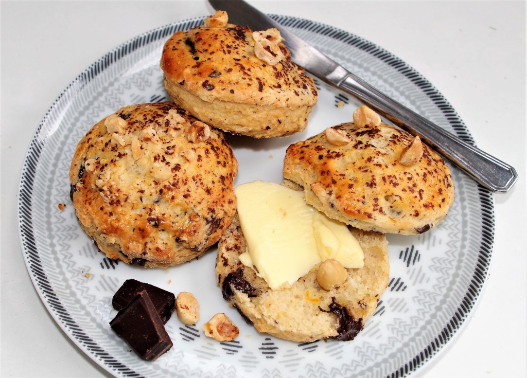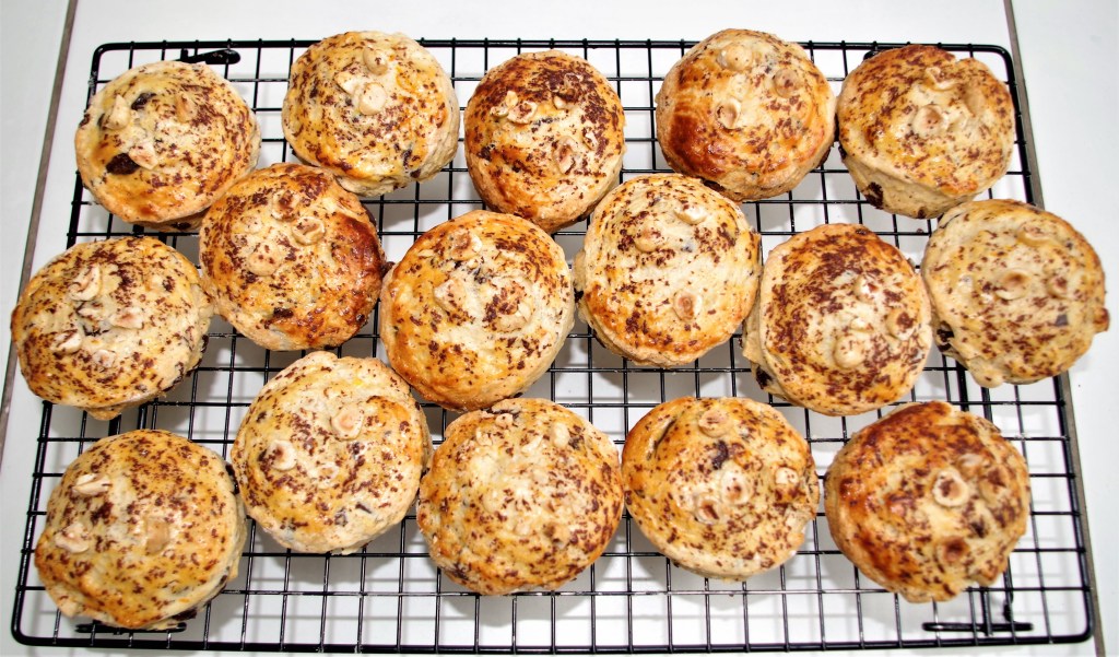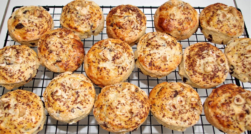 5. Turn out onto a lightly floured surface, knead briefly to bring it together, then roll out to about 3cm thickness. Stamp out circles using a round cutter (5cm – 7cm). Place them on the baking sheets. Mix the reserved buttermilk with the remaining egg then brush the tops and add the reserved nuts and chocolate (you could grate a small square of chocolate over the scones.). If time allows, place in fridge for 20 minutes to rest the dough.