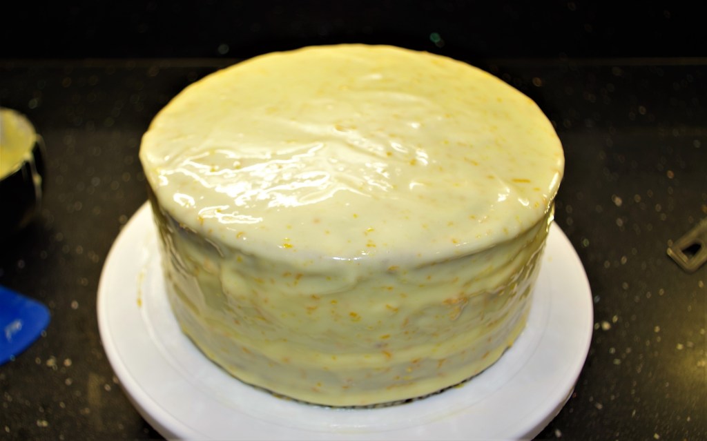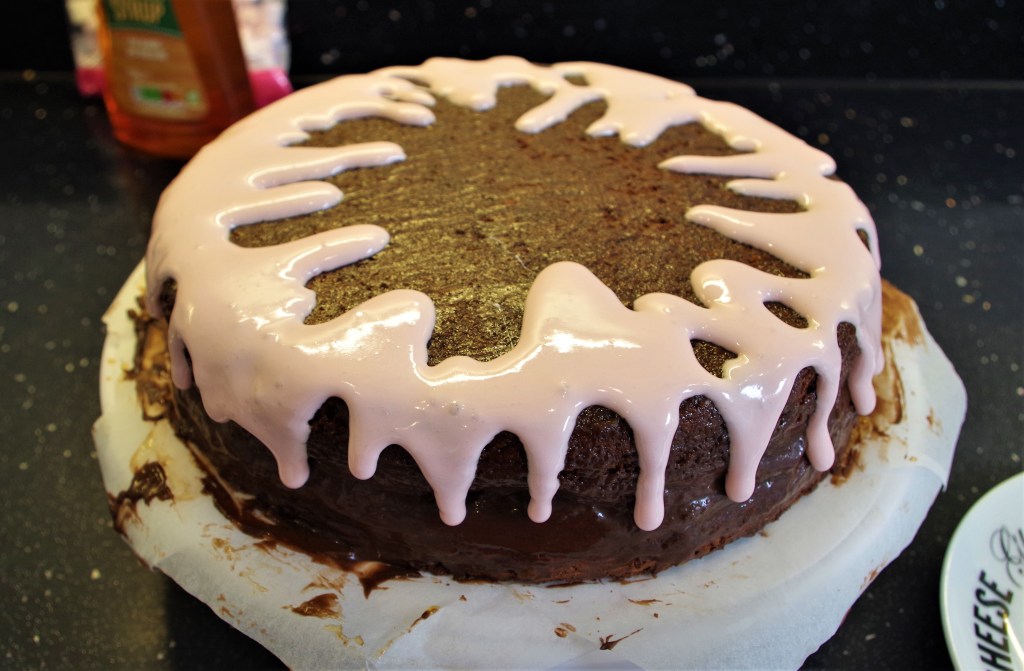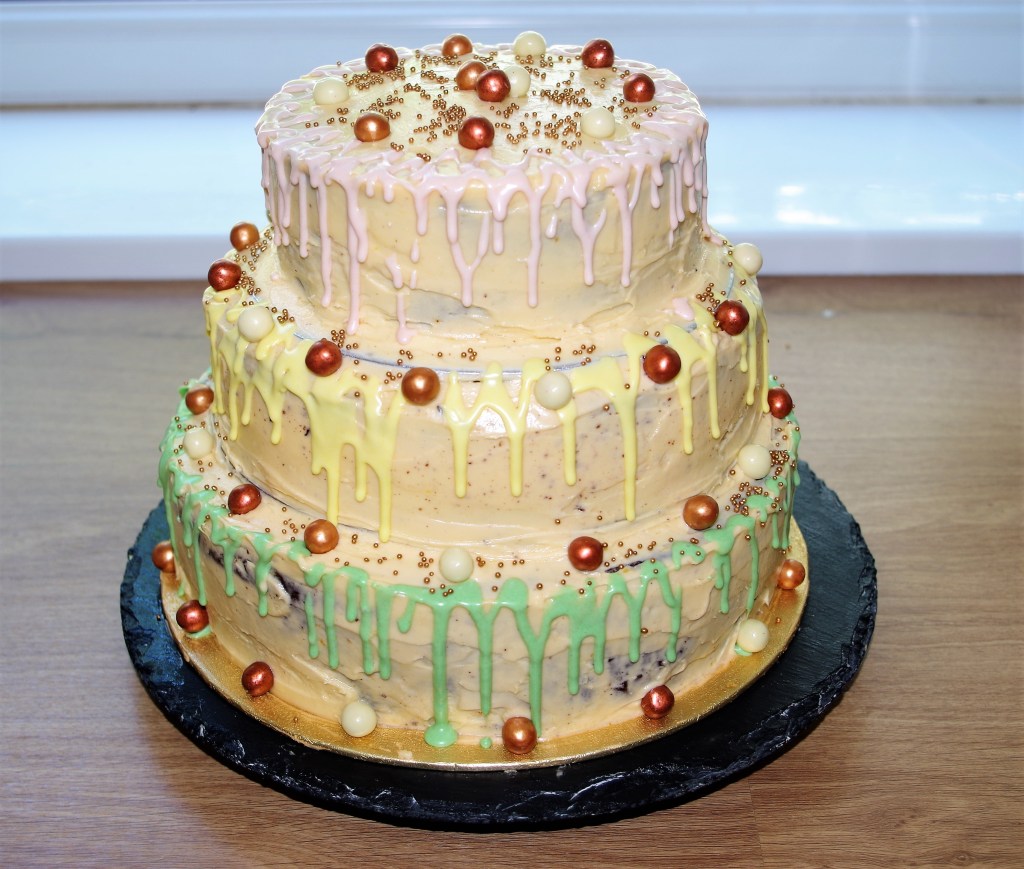 For the coating I made a large batch of the white chocolate cream cheese mixture mentioned above, but I increased the chocolate content to ensure a firmer coating. I also piped coloured white chocolate in “dribbles” on the edge of each tier. (There’s probably a more technical word for it than that.)