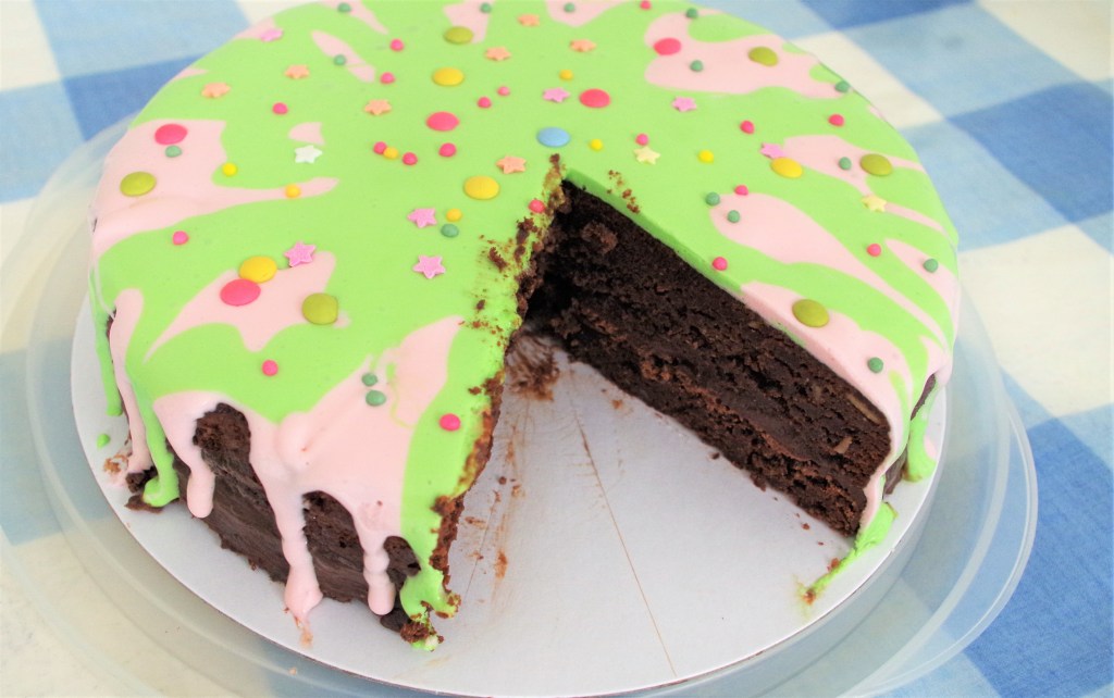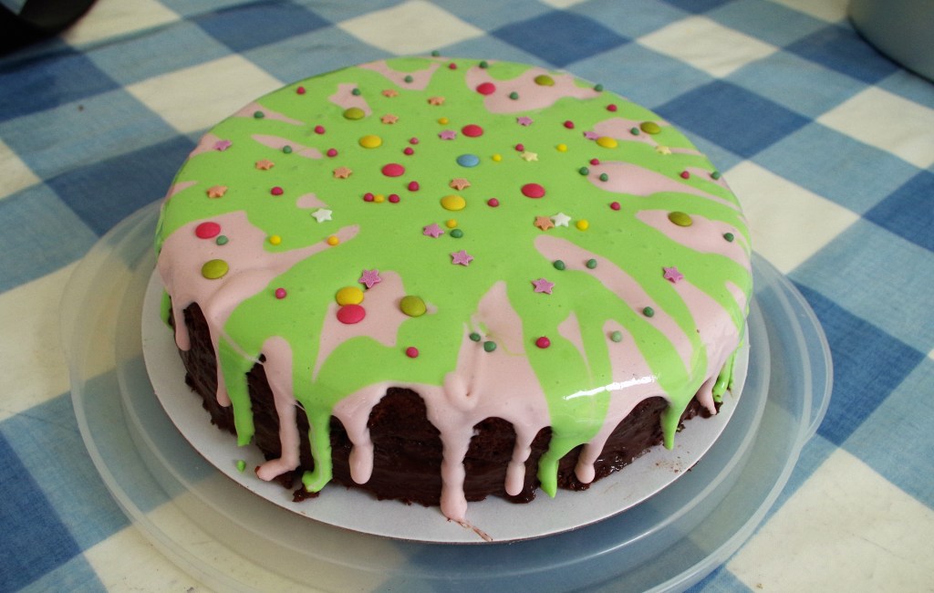 Below are two other versions. First a 23cm cake with a melted marshmallow topping. I’ll put the ingredient measurements for the cake below. For the topping I gently melted 75g mini-marshmallows, 15g golden syrup and 15g butter in a saucepan with some food colouring. When it was ready I spooned it into a piping bag and snipped a small hole before using it.