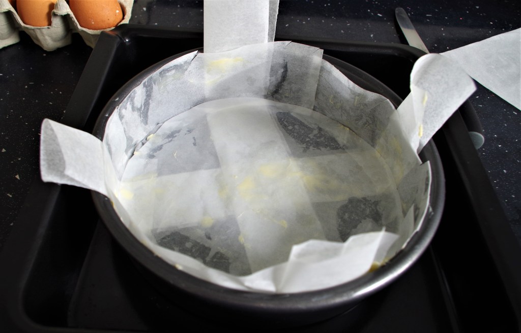 - Grease and line the bottom and sides of the tin with baking paper. (I actually put a cross of baking parchment in the tin before adding a circle over it. This was to make sure I could lift out the baked cake. See Gallery below.)