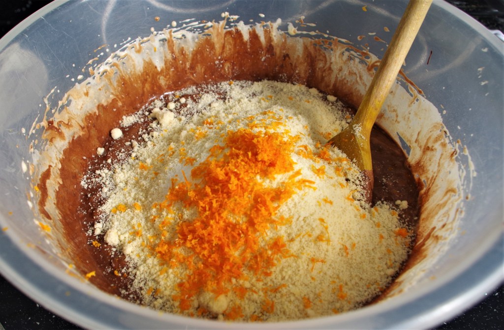 3. Stir the melted chocolate into the egg mixture then add the ground almonds, coffee, salt, orange zest and juice. Mix until well blended.