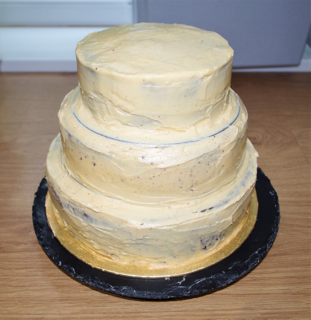 The second version was a rather more ambitious 3-layer wedding cake. The bottom tier was 25cm/10”, the middle tier was 20cm/8” and the top was 15cm/6”. Here are the measurements for the ingredients. (I’ll give them as I converted them from the original, but I don’t see any problems in rounding them up or down a little, if you like “neat” numbers)