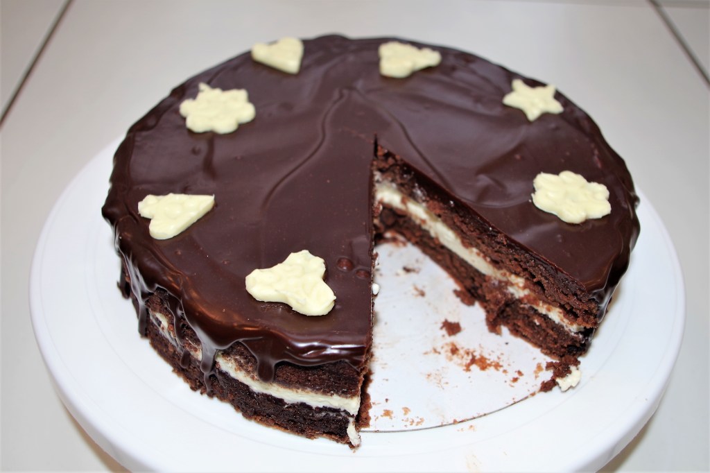 13. Melt the chocolate and rum flavouring in a bain marie then stir in the butter a tablespoon at a time. Remove from the heat and whisk if necessary. Cover the torte and – if desired – encourage the topping to occasionally run down the sides.