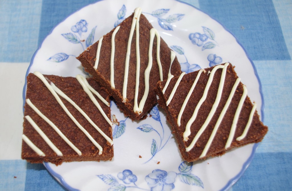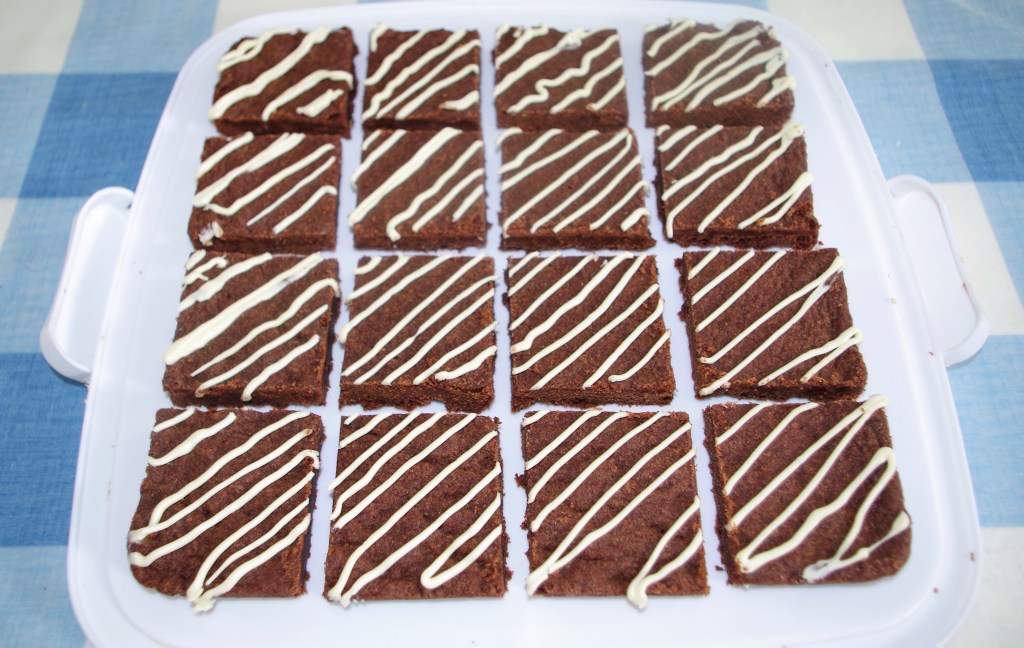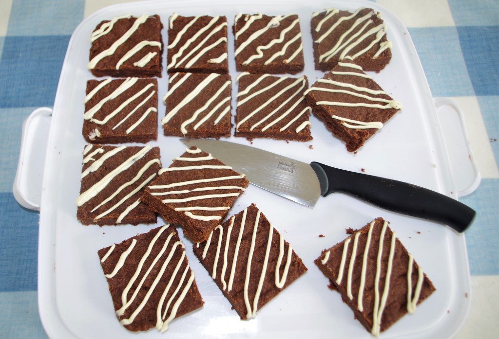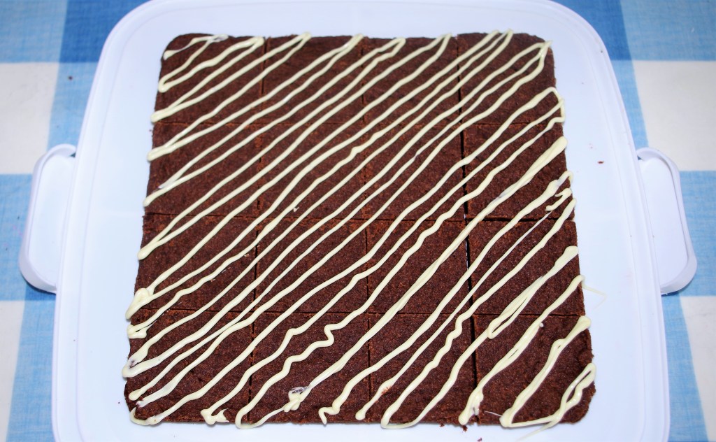 6. To decorate, melt the white chocolate and pour into a piping bag. Snip a very small hole in the end and pipe zig-zag lines over the pieces – hopefully with a much steadier hand than me.