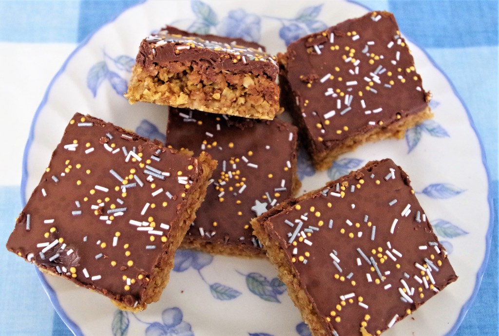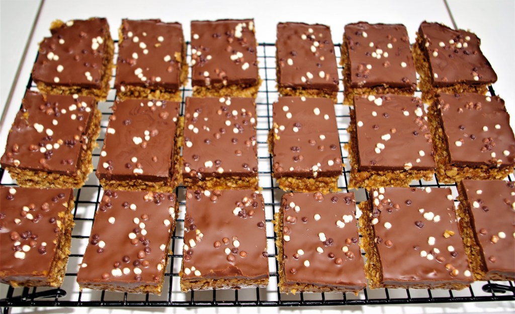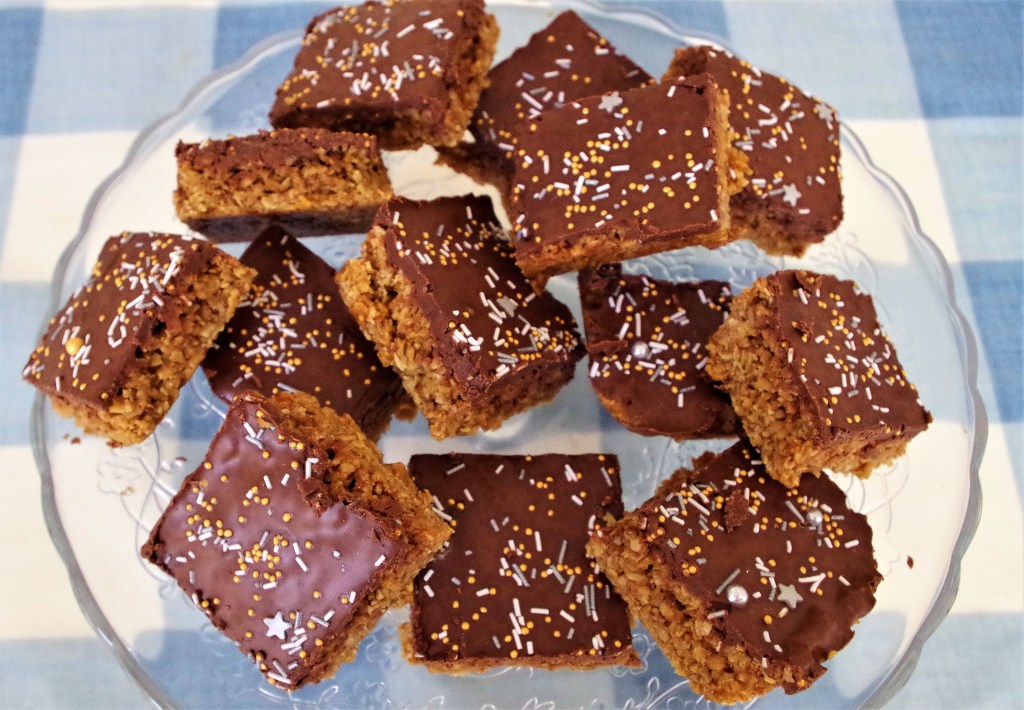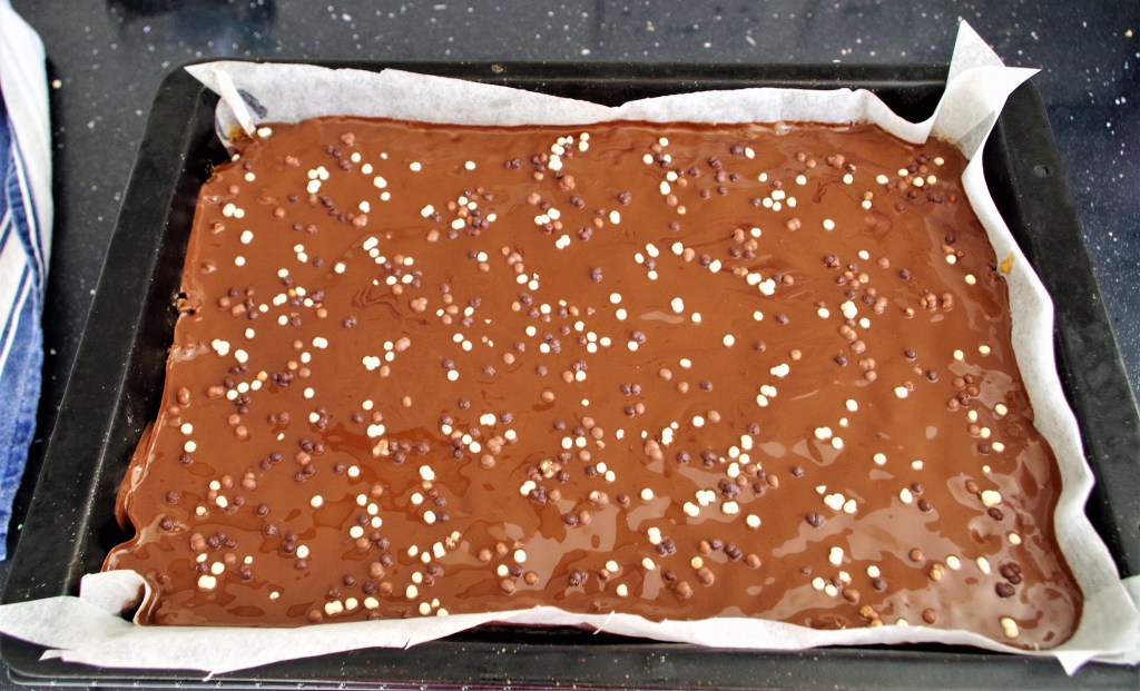 6. Leave it for a few minutes then add your chosen decorations. Once the chocolate has set, cut the flapjack into pieces as required.