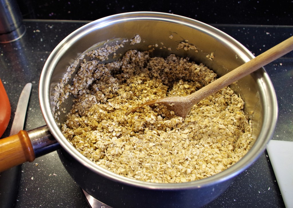 3. Take the saucepan off the heat and stir in the oats and any other “extras” such as apricots and walnuts. Make sure everything is fully coated.