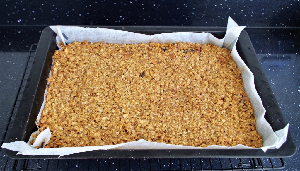 4. Tip into the prepared baking tray and press down firmly with a wooden spoon or just use damp hands. Bake for about 45 – 50 minutes. Leave it to cool in the tray.