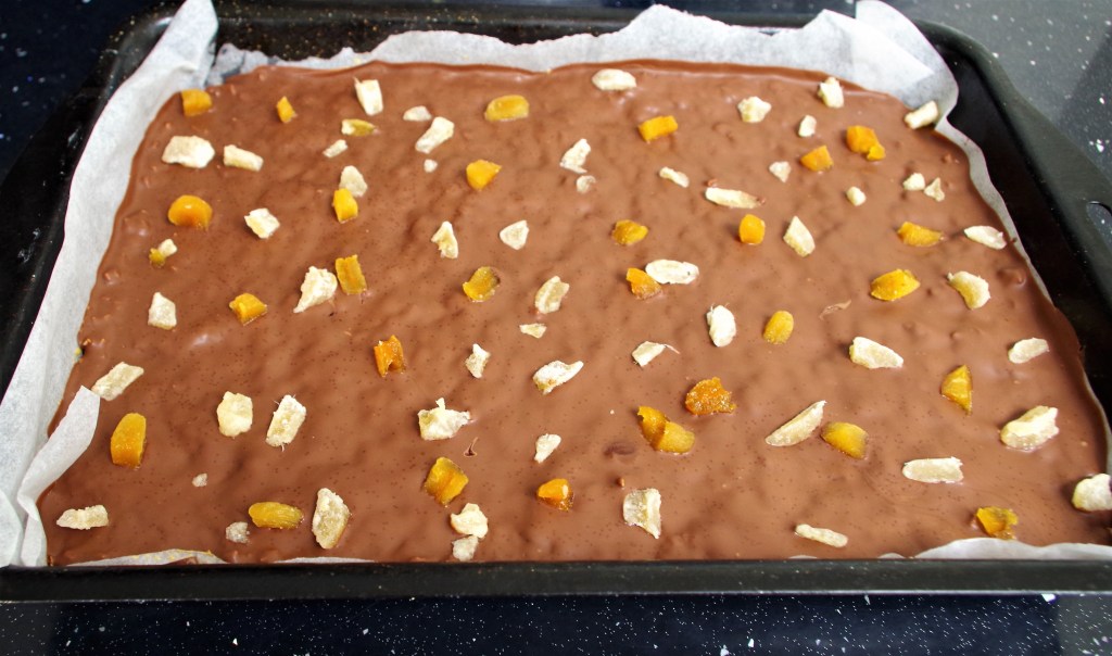 …… third is this apricot and ginger version, still delicious of course. I used milk chocolate on top and put 3 tsp ground ginger into the mix with 100g chopped apricots & 100g crystallised ginger. I was a bit lazy and forgot to trim them before the photos though – sorry.