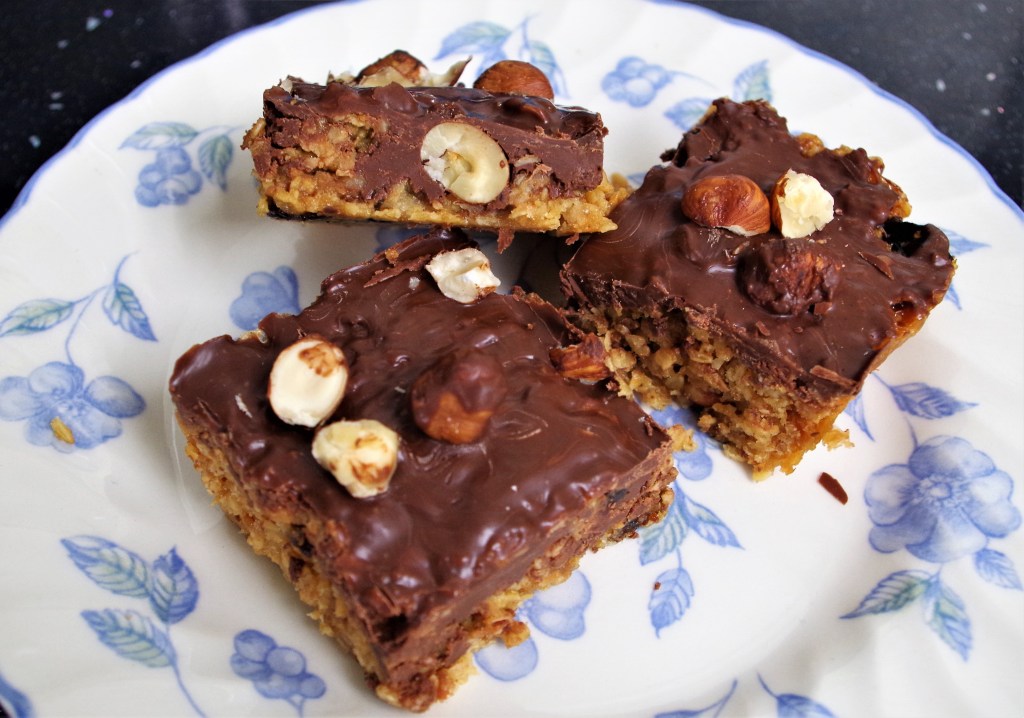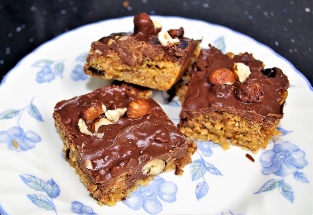 When you want something quick, easy, tasty, filling and “portable”, flapjack is the obvious choice. A lovely thick chocolate topping makes it even better. The ones shown here are a batch I made share while leading a walk in the Peak District. These contain walnuts and apricots, which can be left out or replaced by all sorts of other “goodies” that you have to hand. (Another good thing about flapjack is that most of us probably already have all we need in our cupboards.)