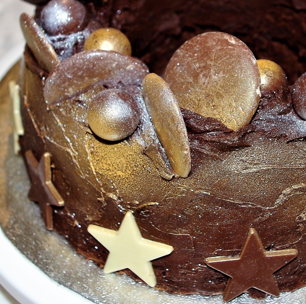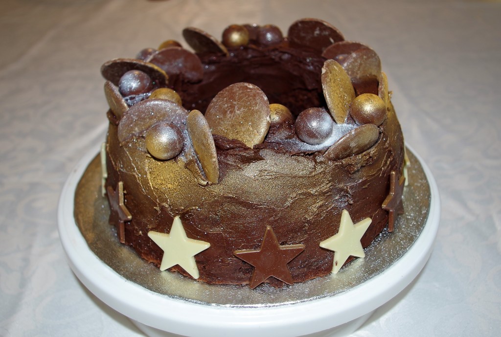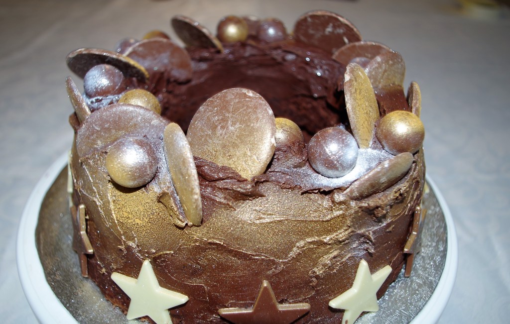 I’m happy with my original description of this as an elegant cake that stands out from the crowd, but it’s equally true to describe it as a tasty bit of gold chocolate bling. Take your pick. And it’s still great for Christmas, or any other time.