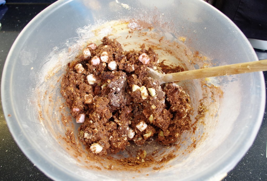 3. Sift in the rest of the flour, cocoa powder, baking powder and salt then stir in the porridge oats. Add in all the dried fruit (or nuts), half the mini marshmallows* and half the chocolate chips*. Mix to combine. (Add milk if needed) * Save enough to put on top of the cookies when baked.