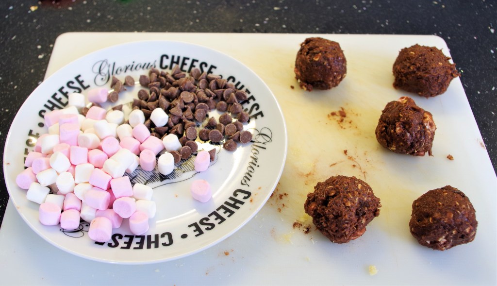 4. Make balls of the mixture, about the size of a walnut. Place on the baking trays and lightly press to flatten them a little. Bake for 12 – 15 minutes.