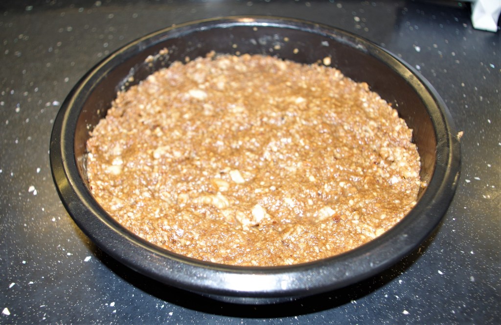2. Whizz the biscuits and spices in a food processor until crumb-like. (Or place in a bag and bash with a rolling pin.) Stir in the walnut pieces. Set aside enough to use later as a topping – about 3 – 4 Tbsp.