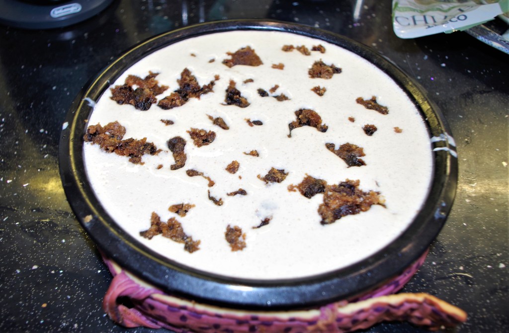 8. Spoon or pour the mixture into the prepared tin and drop in the pieces of Christmas pudding. Some can be pushed in to submerge, others left. Tap the tin a couple of times on your work surface to release any air pockets.