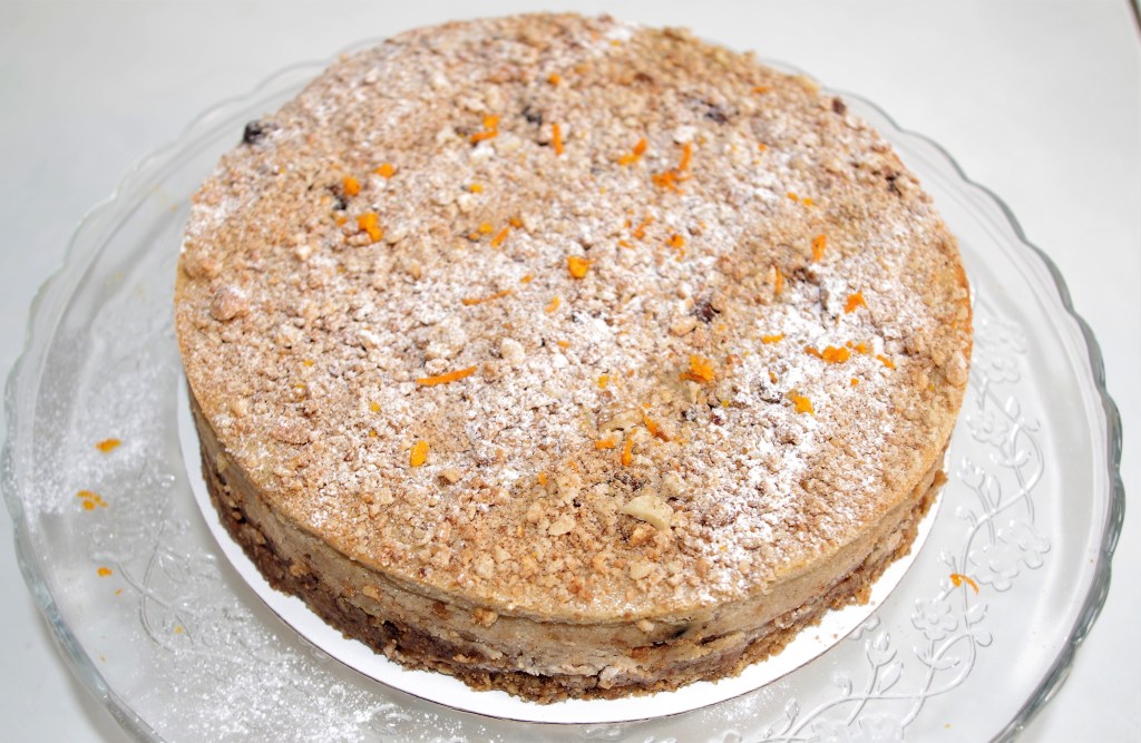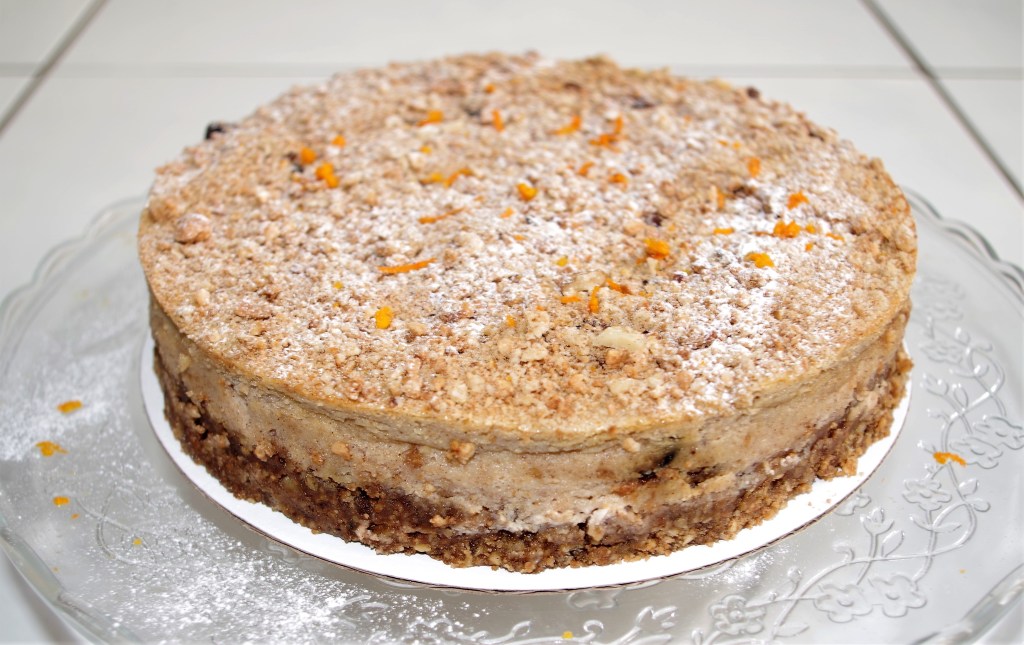 10. Turn the oven off and remove the cheesecake. Sprinkle the reserved biscuit and walnut crumbs over the cheesecake and return it to the oven with the door slightly open until it has cooled fully.