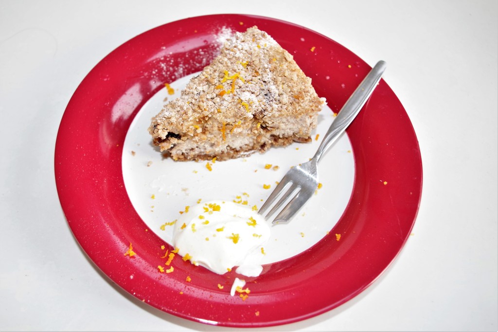 11. Once the cheesecake has cooled, place it in the fridge for 2 – 3 hours or overnight. When ready, remove from the tin and transfer to a plate or cake stand. Before serving, dust with icing sugar and grate over the zest from the second orange half.