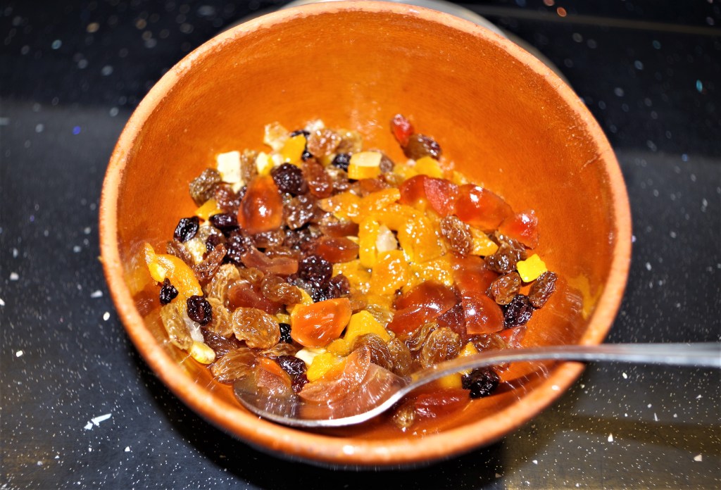 Pre: The day or evening before you intend baking, put all your chosen dried fruit in a shallow bowl and pour over your chosen alcohol. Warm in the microwave for about 20 – 30 seconds. Stir well, cover the bowl and leave overnight.
