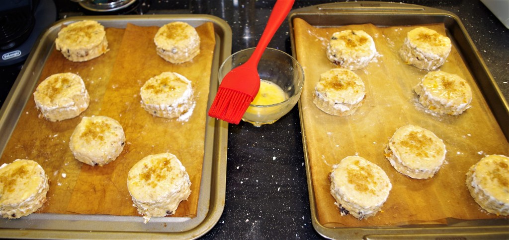 7. Place the scones on the prepared baking sheet and brush the tops with beaten egg, making sure none dribbles down the side as this hampers the rise.
