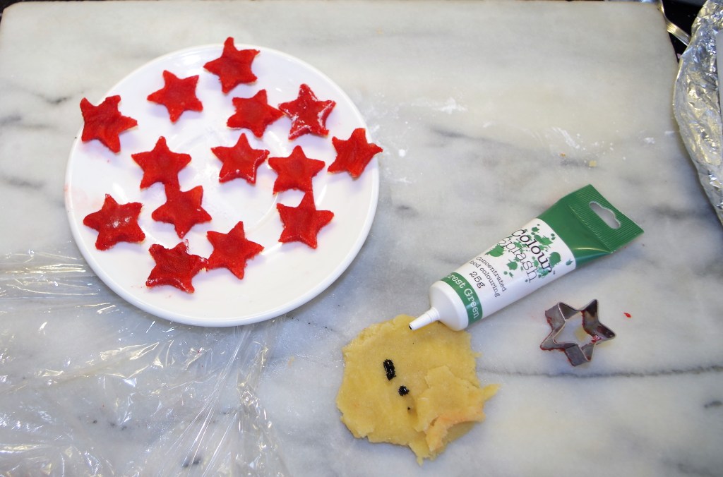 12. Repeat the above with green food dye then place the stars on the scones. They will probably stay on simply by pressing lightly, but if necessary you could “glue” them in place by brushing on a small dab of warmed apricot jam.