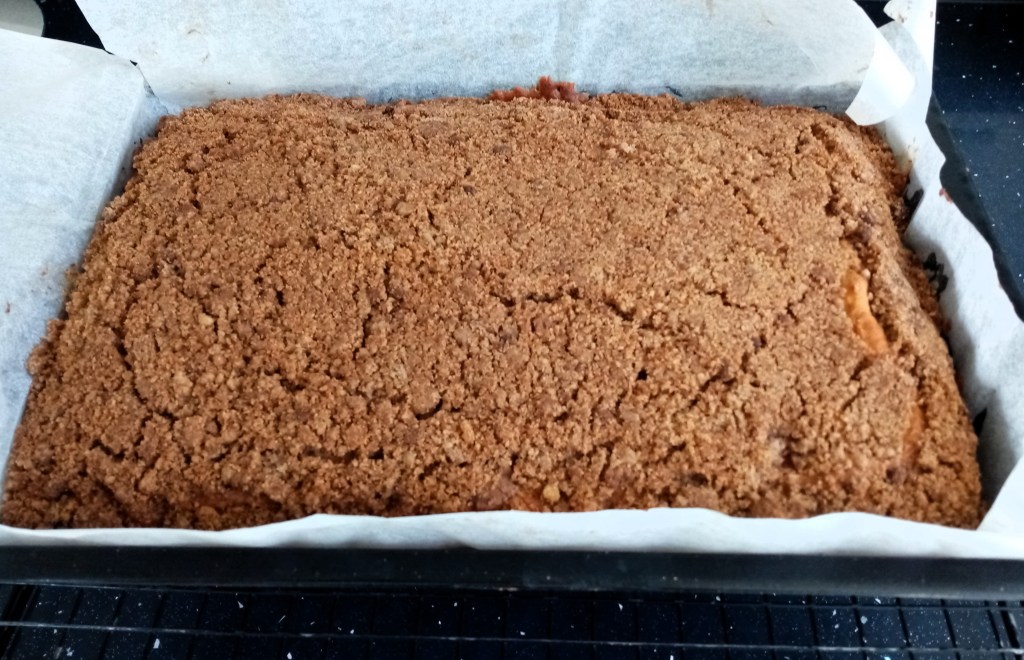 6. Sprinkle over the crumble mixture, making sure it covers the batter completely. Press it in gently but firmly. Bake on the lower part of the oven for 50–60 minutes or until a skewer inserted into the centre of the cake comes out clean.
