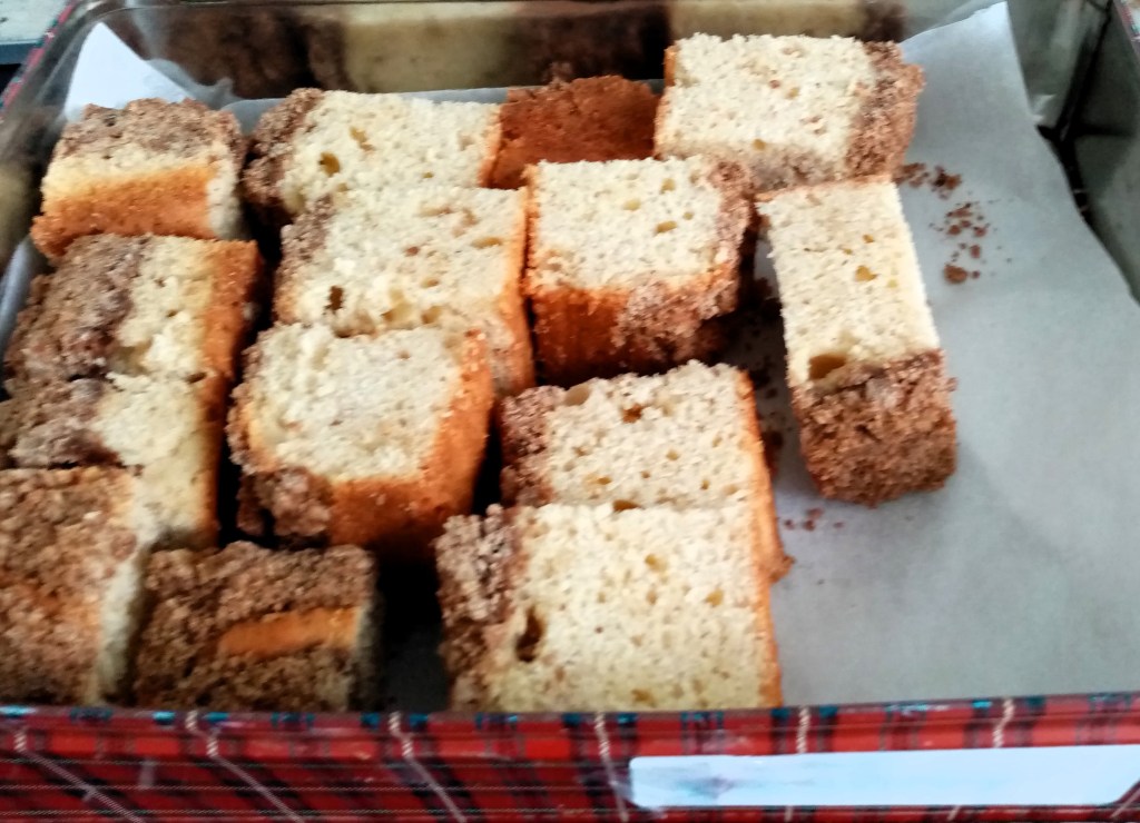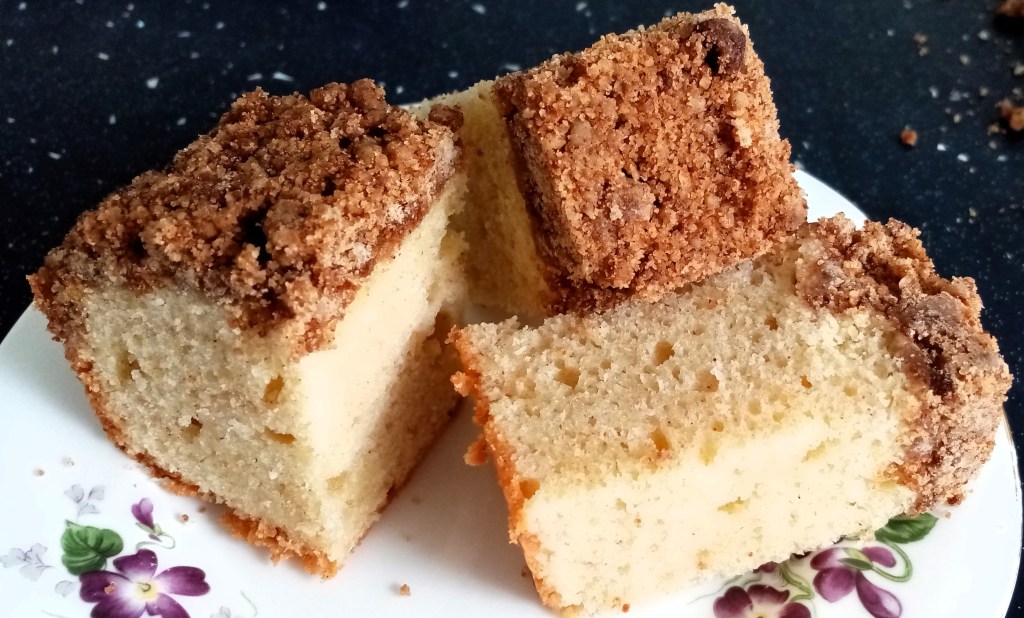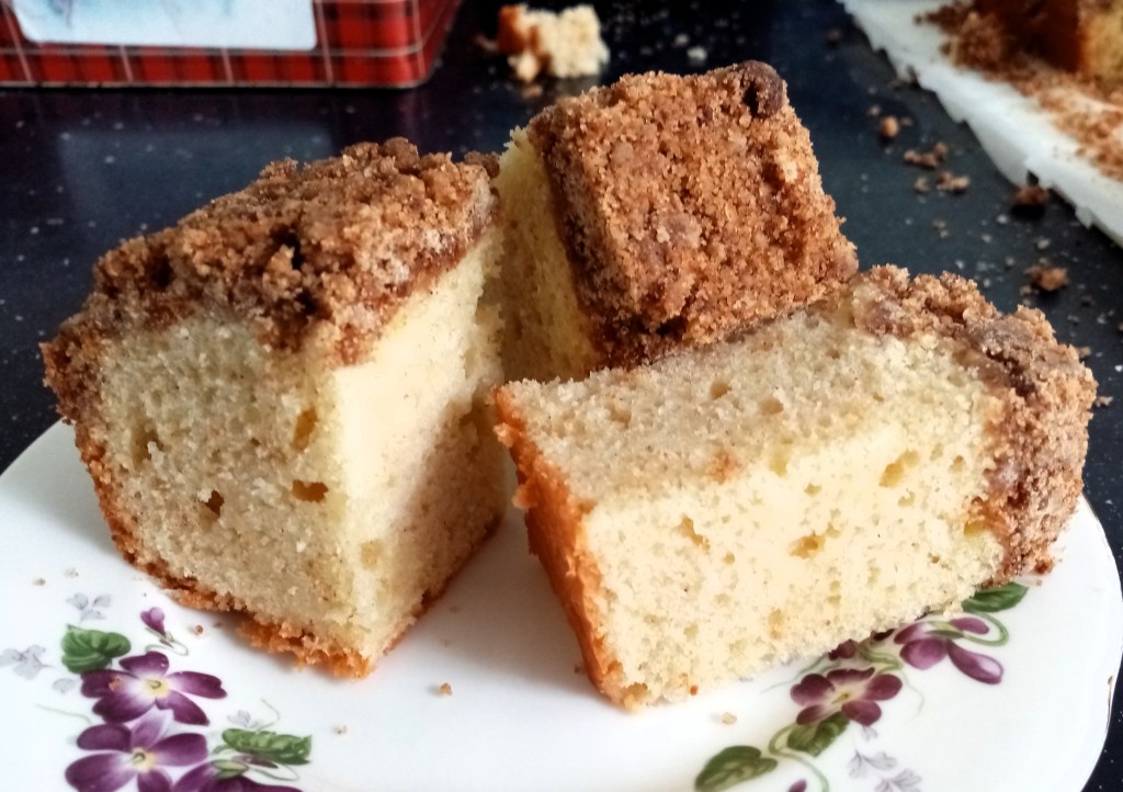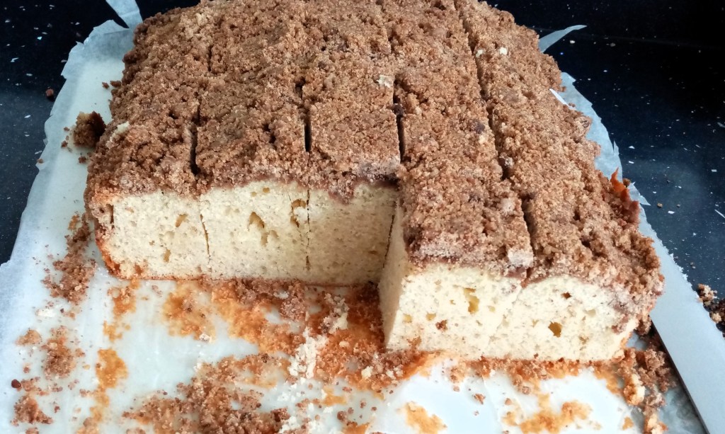 Here’s a big, big cake that’s ideal for a group event. It’s tasty and substantial yet still quite light. It’s easy too, using the American style of making a crumble with melted butter, so there’s no need to even do any rubbing in.
