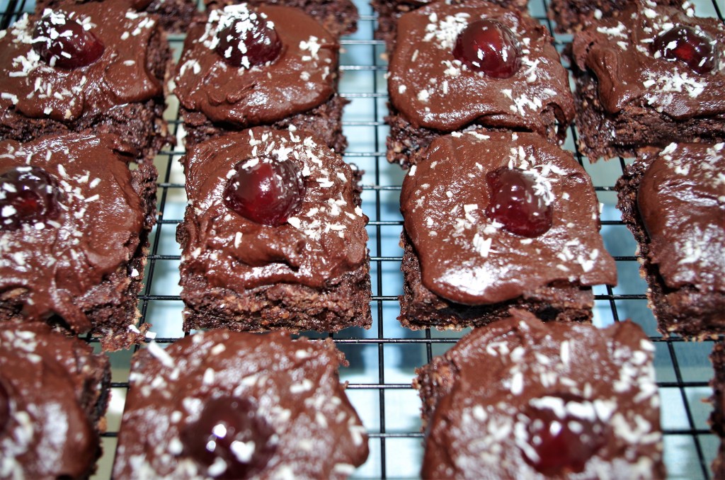 7. Add one of the halved cherries to each piece before the topping sets then sprinkle over the desiccated coconut.