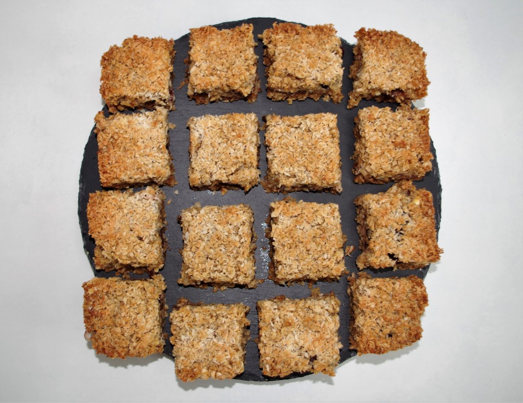 Here’s a rich, moist flapjack variation that’s packed with a great range of flavours and textures. Combining pear and white chocolate in other recent bakes* has been quite a revelation for me. These are definitely worth trying for yourself.