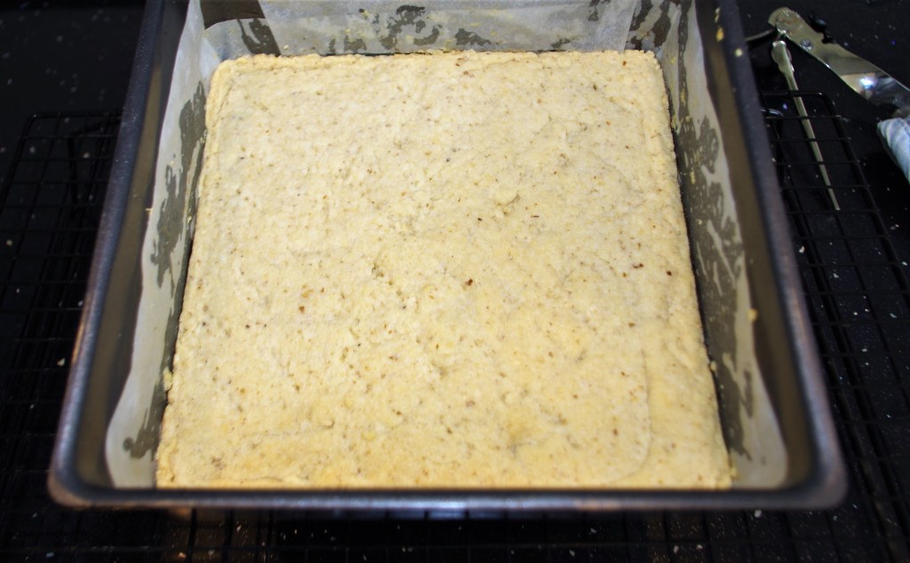 3. Press the dough into the tin and work it level using the back of a wooden spoon or a plastic scraper. Stab with a fork a few times then bake for 25 minutes, or until light golden. Set aside.