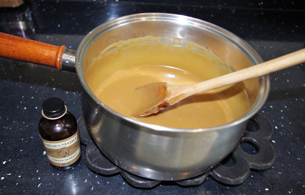 4. To make the caramel filling, place butter, condensed milk and sugar in a non-stick saucepan over a gentle heat. Stir and melt everything together, then add the coffee extract or granules. Taste it to see if you need any more before bringing it to the boil, then simmer for 10 -12 minutes, stirring all the time.