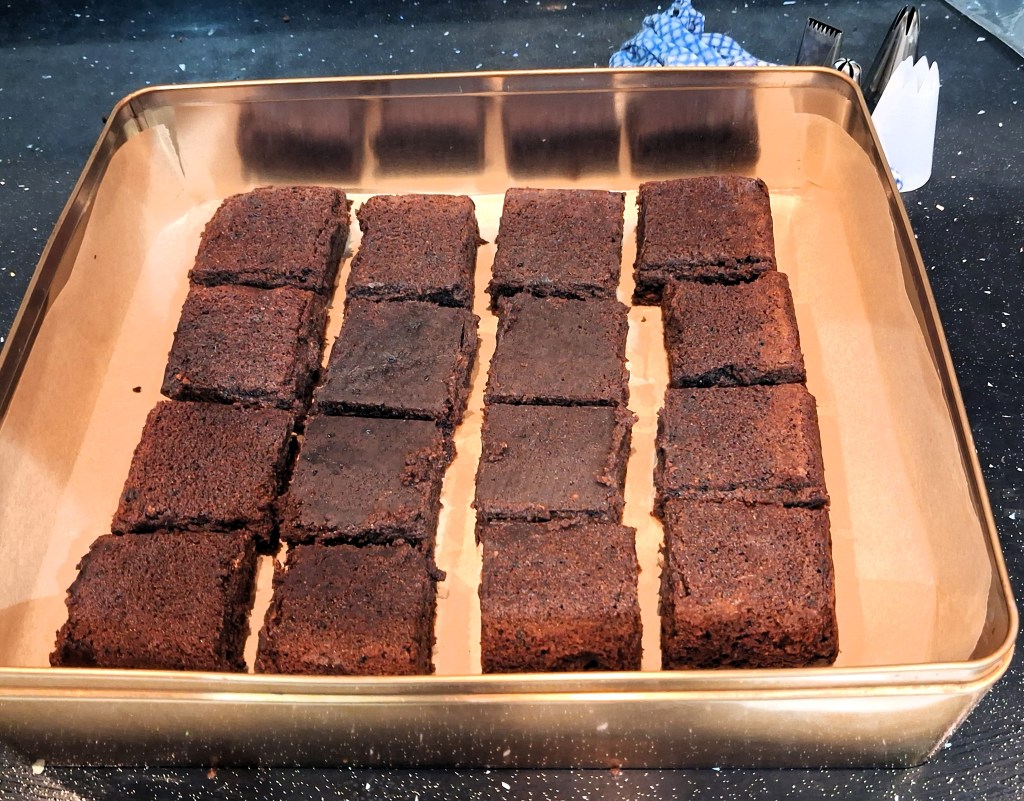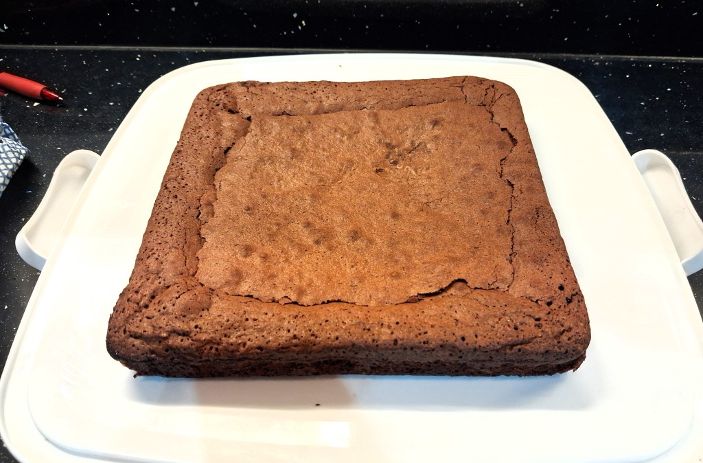 5. Bake for 25 – 30 minutes. The edges should look firm and well-baked and the centre should have a slight wobble. Let the brownie block cool completely in the tin.