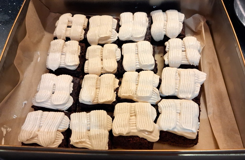 8. Spread or pipe the filling over the brownies. (The photos below show that I actually put the brownies into a tin before piping. This worked quite well and also enabled me to put the tin into the fridge overnight as I was transporting it to church the next day for after our morning meeting.)
