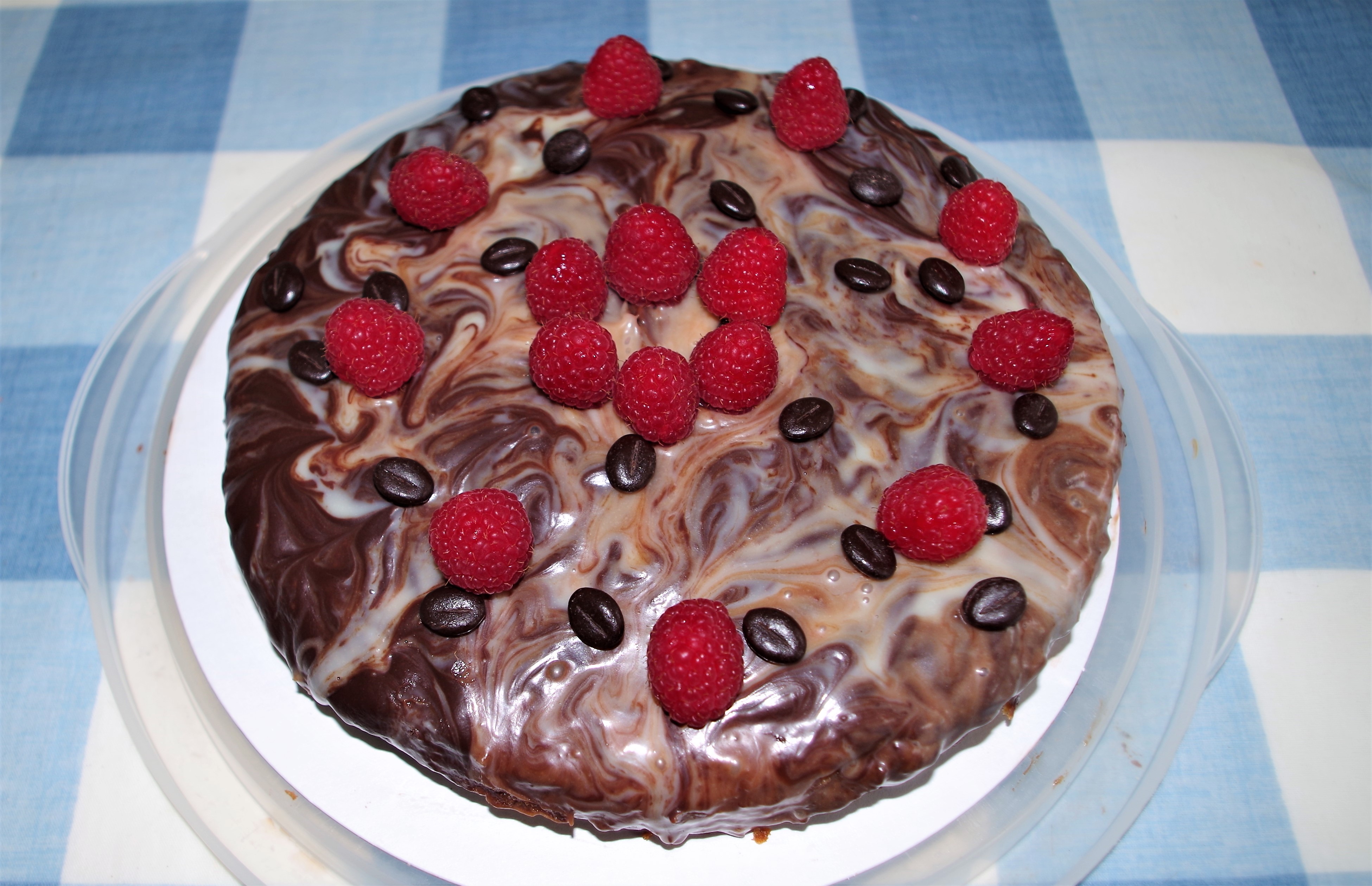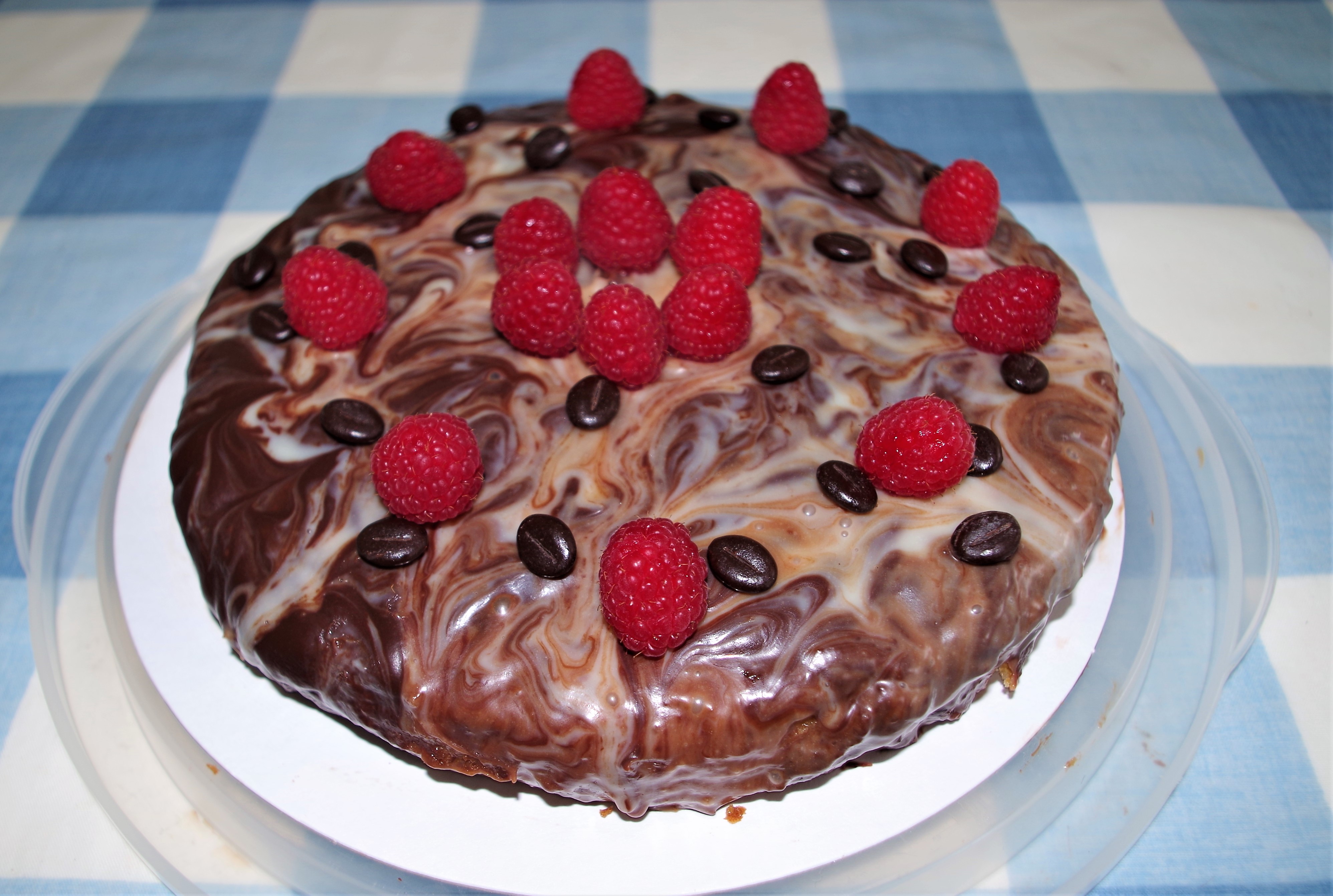 - Remove the cake from the fridge and place on a wire rack with a tray beneath to retrieve any “escaping” chocolate. Allow the chocolate glazes to cool slightly then pour on top randomly, letting them each run down the sides of the cake, also randomly. Use a cocktail stick to swirl the glazes into a marbled effect. (Take care not to overdo this otherwise it will create a single light brown colour) If necessary, put cake in fridge for 30 – 40 minutes to set the glaze.