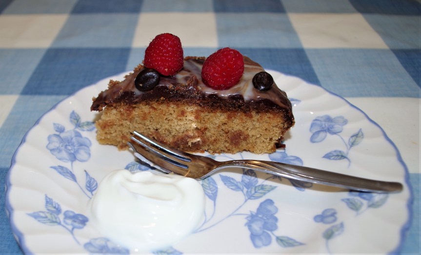 - Spoon or pour the mixture into the prepared tin and level the surface. Bake for 40 – 50 minutes, until risen, firm and golden. (Or test by inserting a skewer into the middle. If it comes out clean, the cake is ready.)